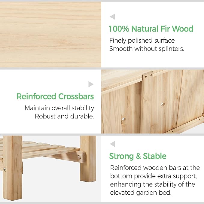 - Solid Fir Wood: The raised garden bed is made of non-painted fir wood, known for its strength and stability. The thick solid boards are polished with smooth surfaces and no burrs or wood splinters