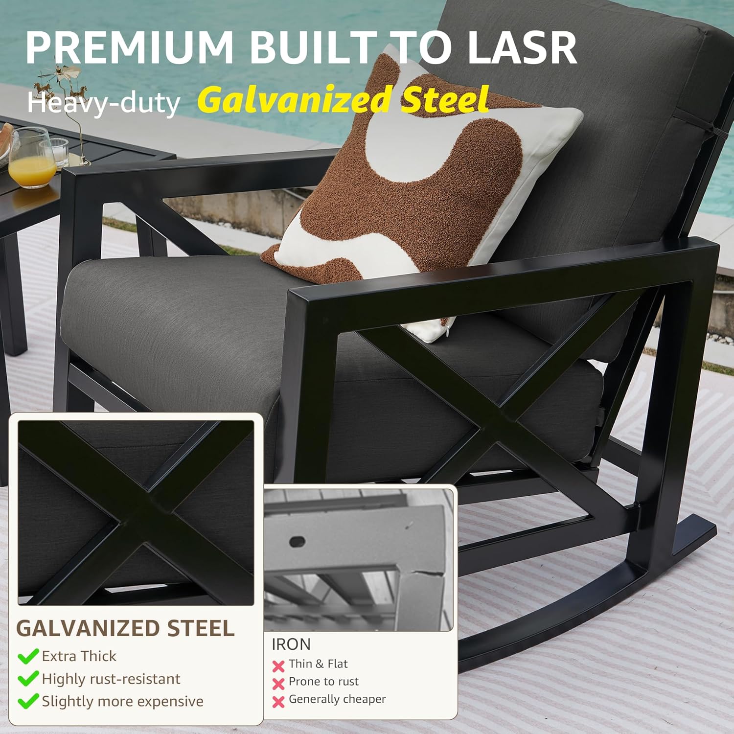 - High Quality Strong and Robust Iron Material:With 2 rocking padded cushion chairs and 1 metal table.With anti-rust powder-coated steel frame of rocking chairs, metal table and waterproof weather-resistant fabric cushions has good strength and stability.Patio Furniture Set Uv and rust protection, Unique frame reinforcement and weighted design ,stability and bearing force is higher than other rocking Chairs Patio Bistro Set.