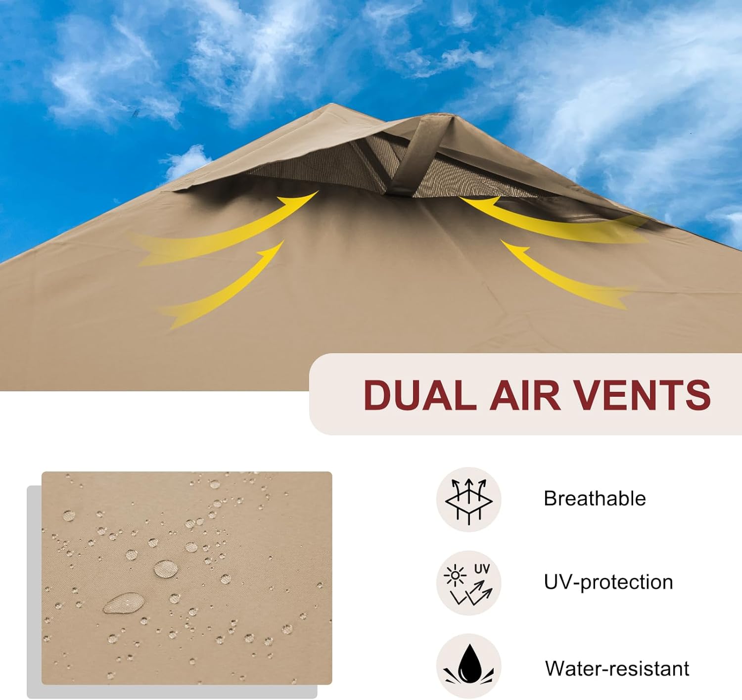 - TWO-TIER ROOF: The roof of the gazebo is designed with two air vents, providing ventilation and stability during windy conditions. The top fabric is made of thick polyester that is fire retardant, water-resistant, and offers UV protection.