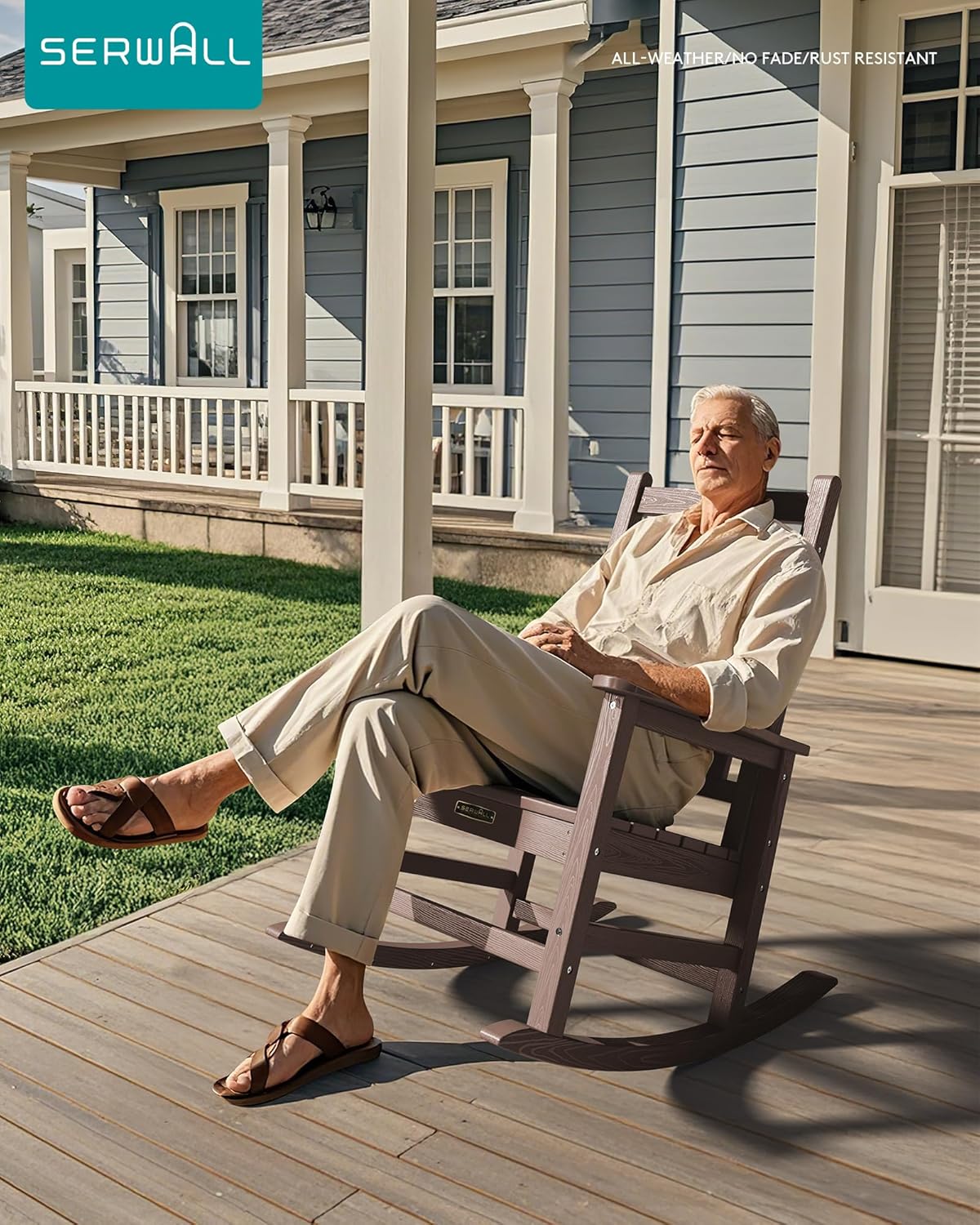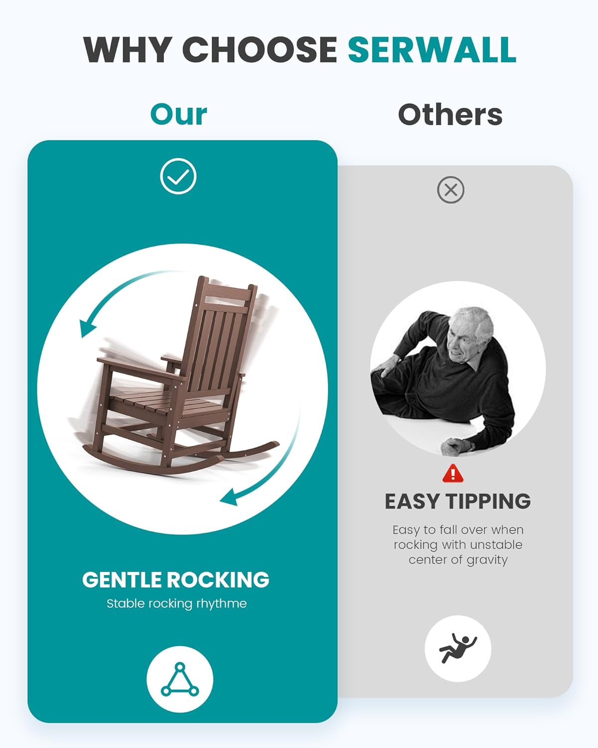 - Details Make It Successful: This porch rocker features an ergonomic curved backrest—unlike traditional straight-back designs—providing superior reclining comfort. With wide armrests and a contoured seat, the SERWALL rocking chair alleviates fatigue. (Tip: Pair it with our cushion [ASIN:B0D7Q1V8ZC] for added comfort.)
