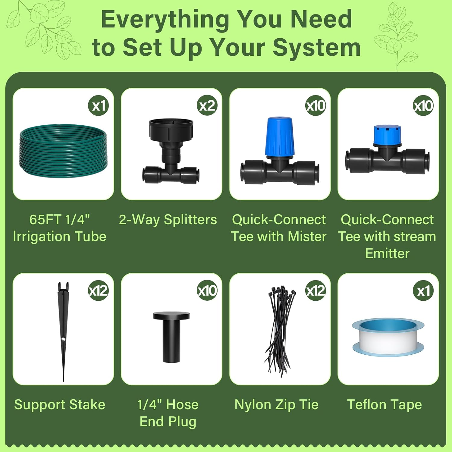 - 🚀 65FT Easy Drip Irrigation Kit – A complete automatic drip irrigation system for efficient garden watering! Includes 65FT of 1/4” irrigation tubing, perfect for drip line irrigation, greenhouse watering systems, and raised bed watering systems.