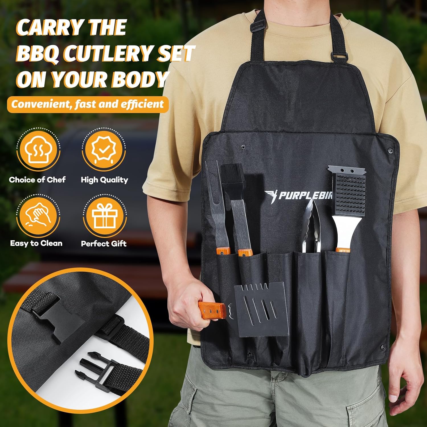 PURPLEBIRD Grill Utensils Set with Brush - 5pcs Grilling Tools Set with Bag Apron, Heavy Duty BBQ Tool Sets with Long Wood Handle, Stainless Grilling Accessories for Outdoor Grill