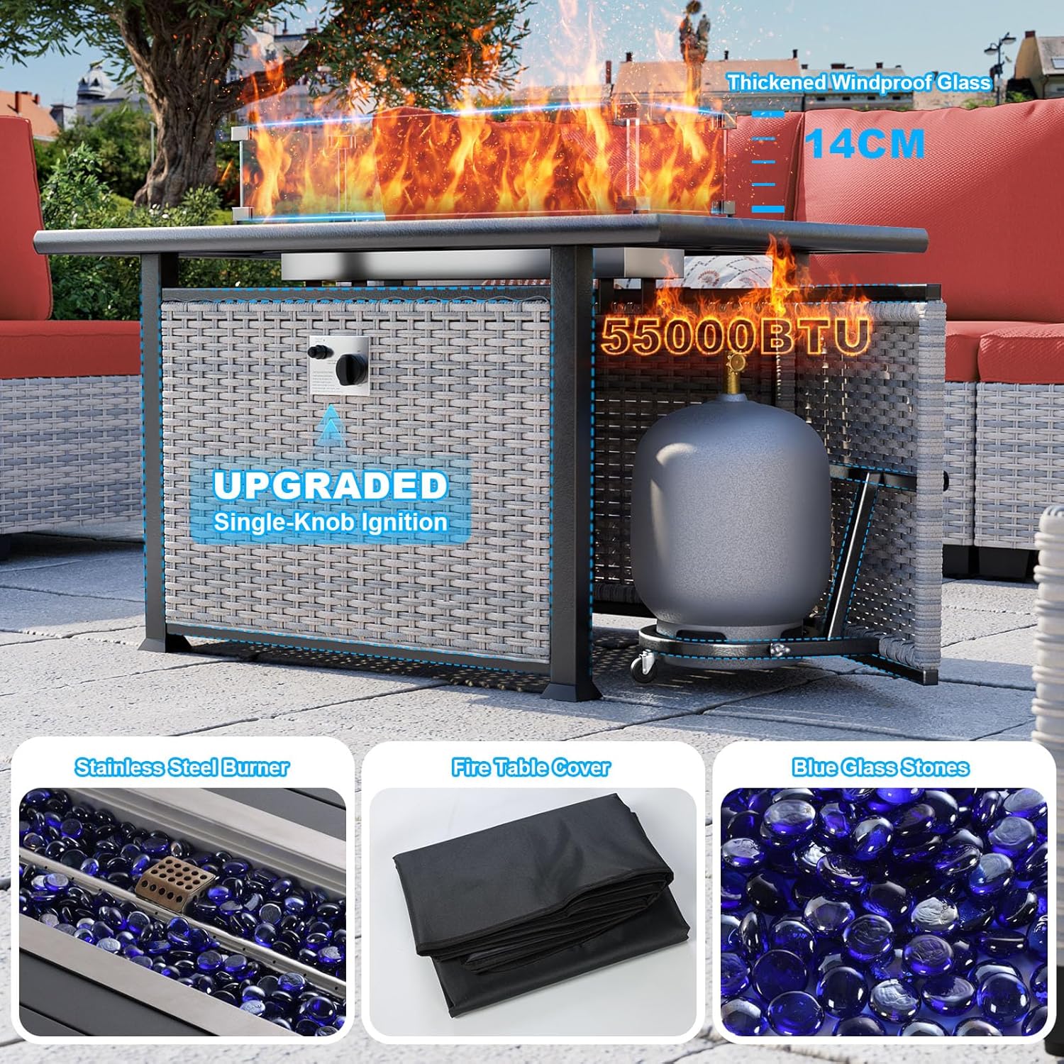 8-Piece Patio Furniture Set, Outdoor Patio Furniture with 55,000 BTU Fire Pit Table, Thick Cushions, Modular Patio Sofa, Dual-Strand Wicker Rattan, Rust-Resistant Frame, Red