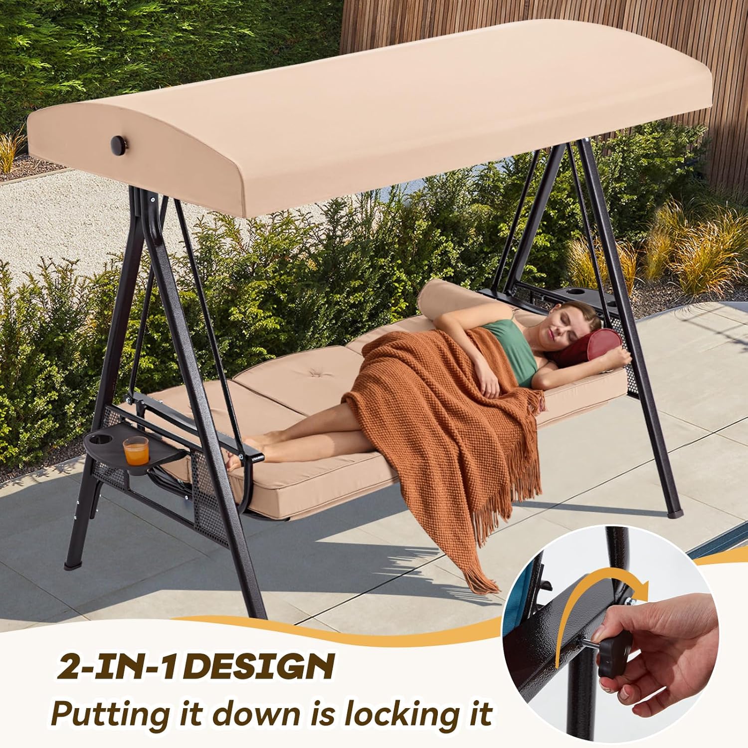 3 in 1 Outdoor Porch Swing with Adjustable Canopy, 3 Seat Outdoor Swing for Adults, Patio Swing Chair with Thickened Cushions,Pillows & Cup Holders for Backyard, Porch, Garden(Khaki)