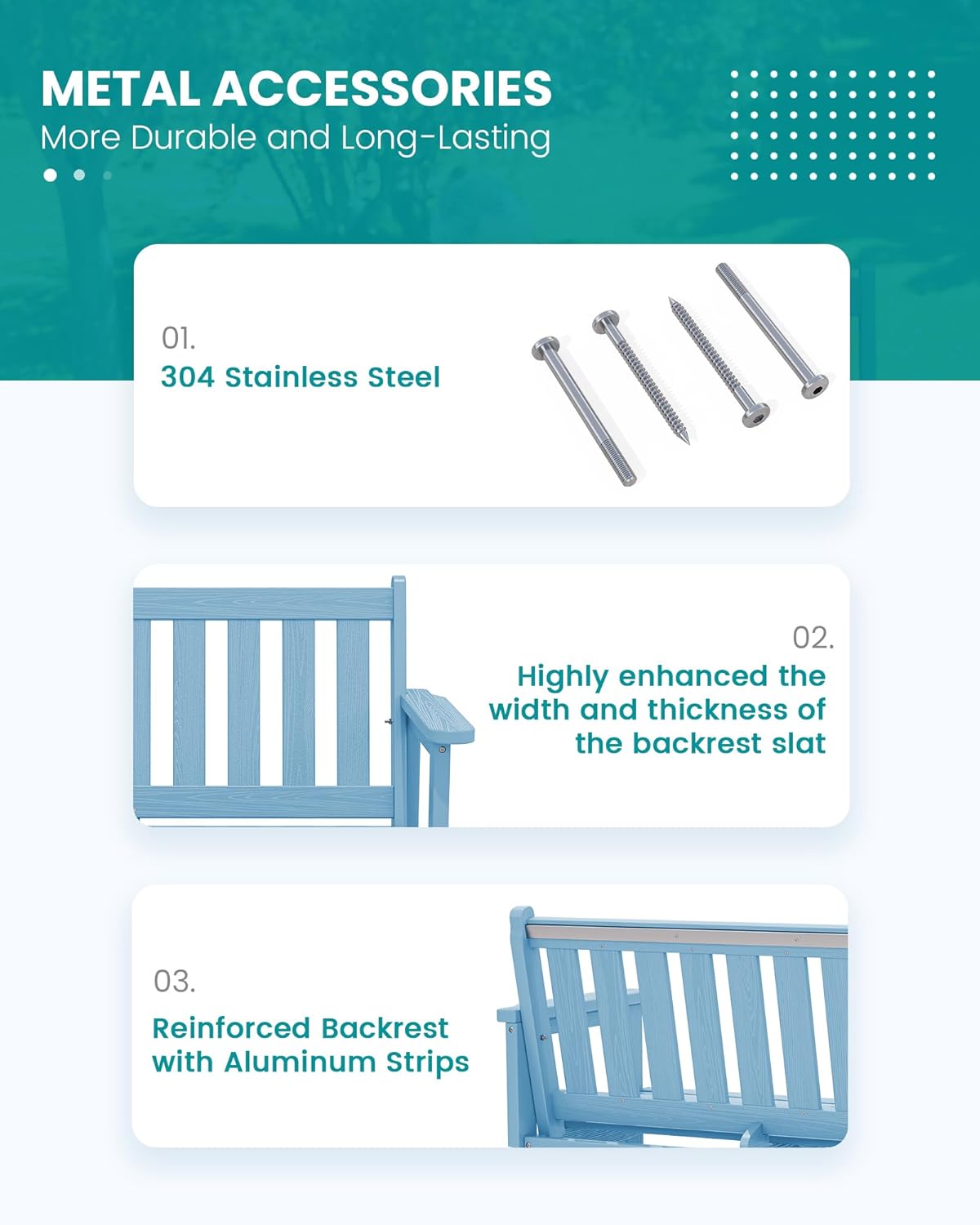 - Reinforced Aluminum Bar: SERWALL garden benches for outdoors are built to last, with sturdy aluminum strips reinforcing the backrest for added durability without compromising comfort. The reinforced chair is more durable and resistant to deformation, ensuring long-term outdoor use.