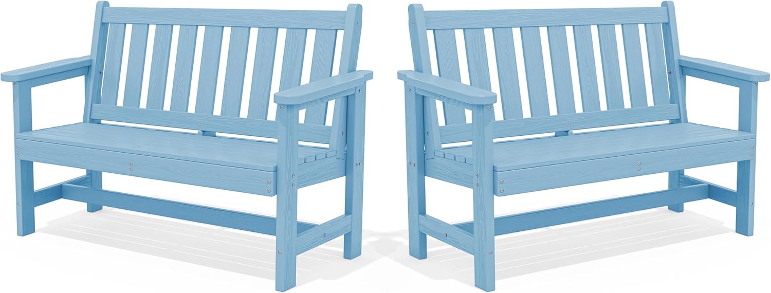 SERWALL Outdoor Bench, HDPE Outdoor Benches Weatherproof, 2-Person Garden Bench with 660 lbs Weight Capacity, Patio Benches for Outdoors, Garden, Porch, Backyard and Park, Light Blue, 2 Pack