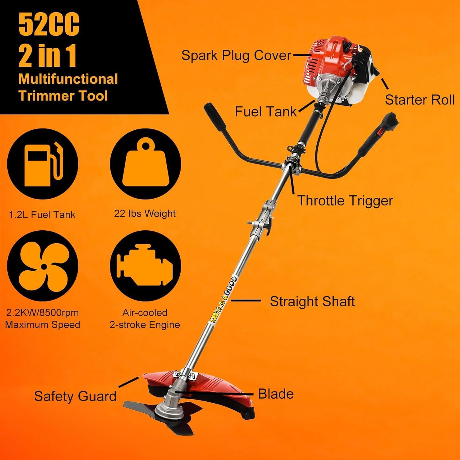- 【Powerful Motor】2-in-1 gas weed eater uses a 2.2KW high-power two-stroke engine, which can provide a displacement of 52cc and a speed of up to 8500rpm. It can easily complete the tasks of weeding and mowing the lawn in the garden. The engine uses 25: 1 mixture of unleaded gasoline and two-stroke oil, with a fuel tank capacity of 1.2 L, which can maximize fuel utilization and improve energy utilization.
