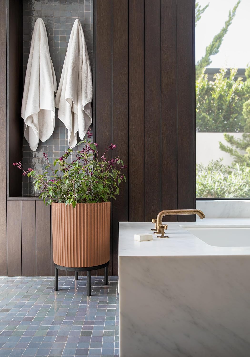 Veradek Demi Series Round Planter w/Stand for Porch/Patio | Durable Plastic-Stone Composite & Wooden Stand | Modern Décor for Tall Plants, Flowers