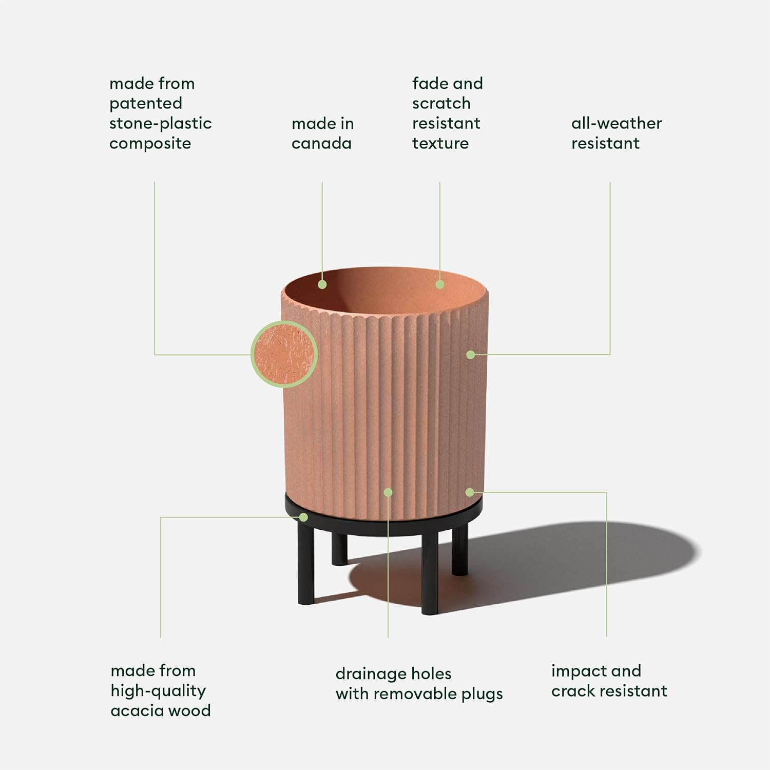 • Material : Plastic-stone composite planter & Acaia wood stand