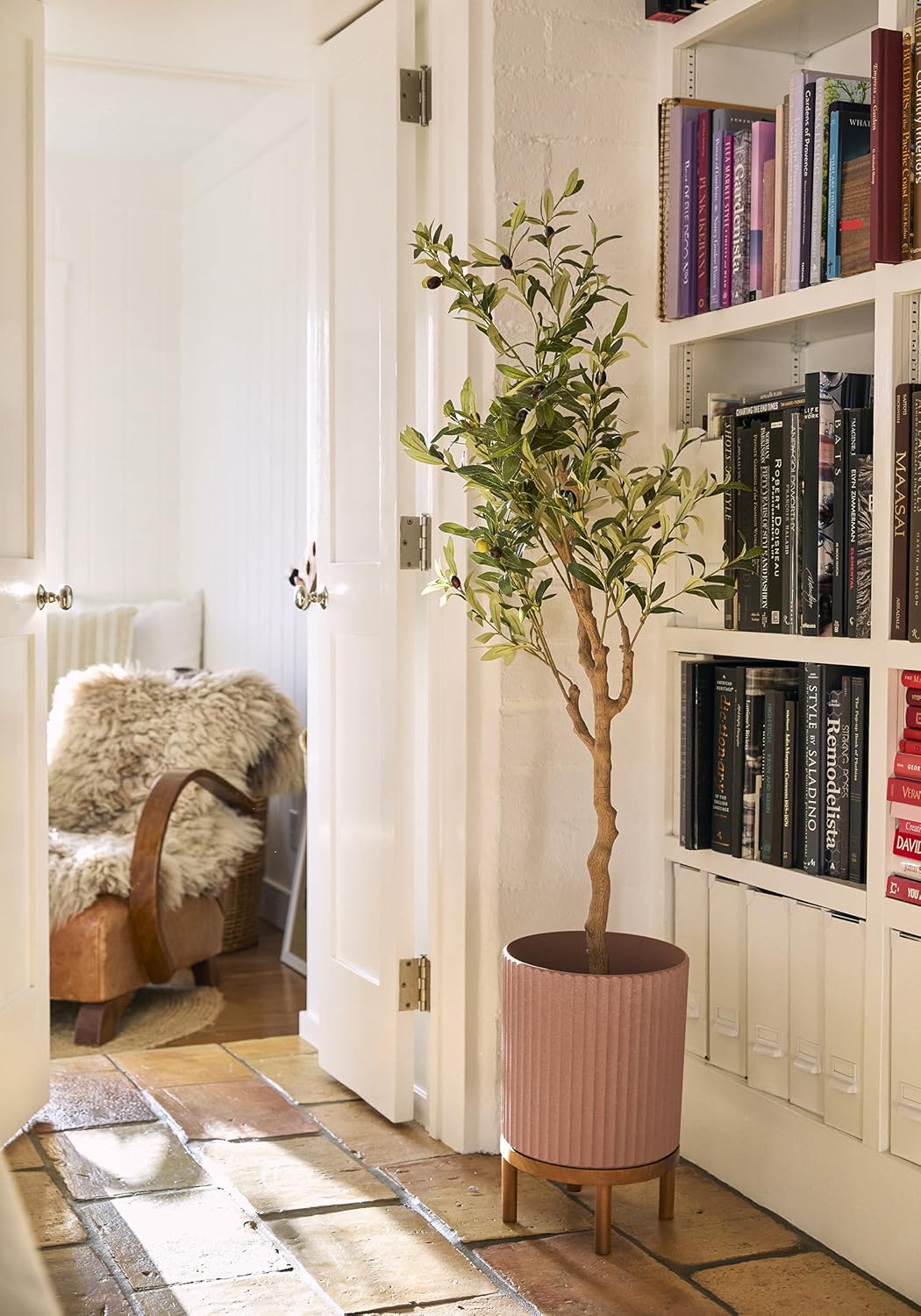 Veradek Demi Series Round Planter w/Stand for Porch/Patio | Durable Plastic-Stone Composite & Wooden Stand | Modern Décor for Tall Plants, Flowers