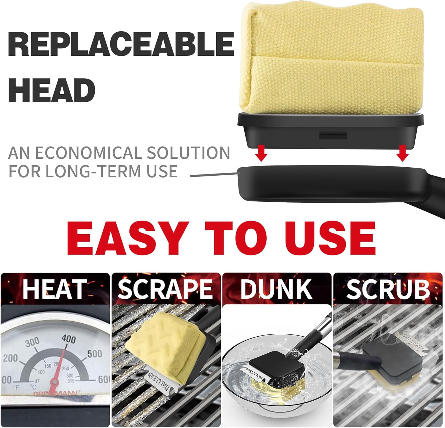 - 【Trapezoid-Shaped Design Sponge Grill Brush Head 】Keep your grill clean and safe with the DALLLEAN bristle-free grill brush. The sponge head is made of heat-resistant foam and wrapped in a high-temp fabric, unlike wire grill brushes, no dangerous metal bristles will end up in your food.