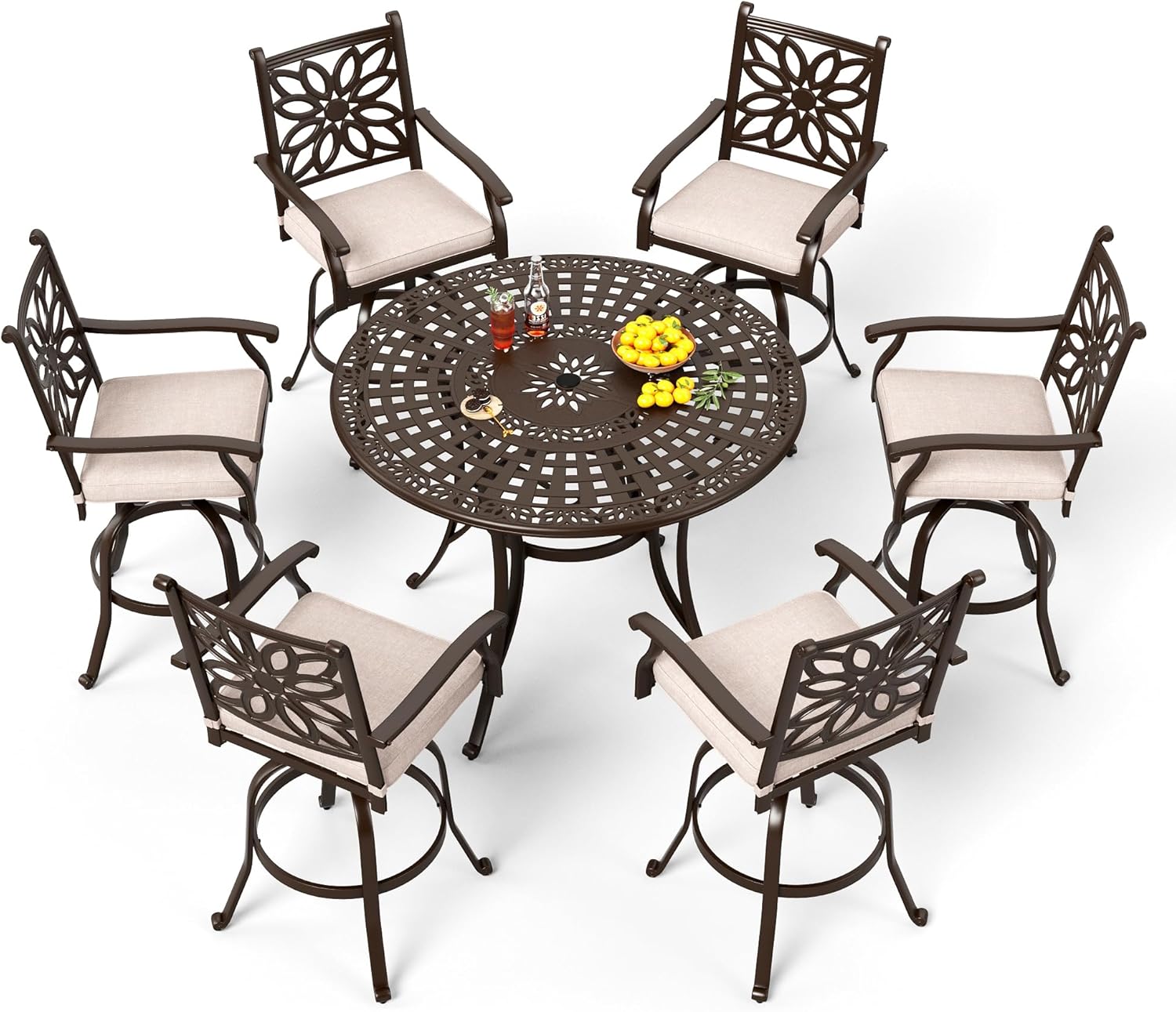 - 7-Piece Bar Height Patio Dining Set: Transform your outdoor space with the PHI VILLA 7-piece dining set. This set features 6 stylish cast aluminum swivel bar stools and a spacious round high bar dining table. Designed for elegance and comfort, it’s perfect for enhancing any backyard oasis, garden, deck, or lawn