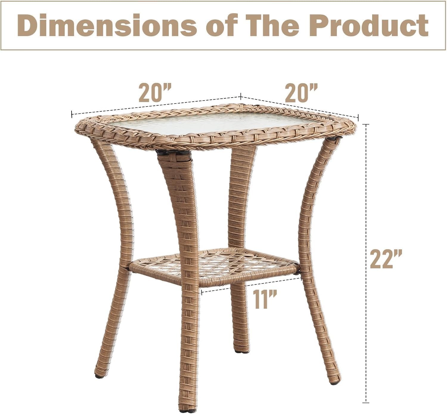 - DUAL TIER SIDE TABLE - The patio side table features a a water-wave tempered glass top with handwoven rattan borders in tabletop tier. The a hollow rattan shelf on secondary tier serves as both a stabilizing structure and a temporary storage area, holding books, snacks, or decor to maintain a clutter-free desktop.