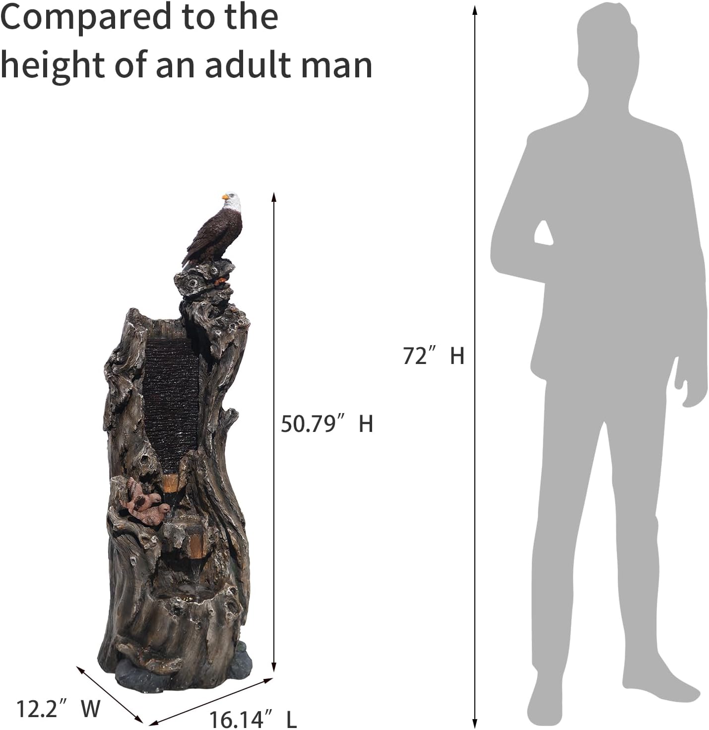 - Majestic Bald Eagle Design: YZM stunning water fountain features a bold design with a bald eagle perched atop a tree stump, symbolizing strength and freedom. It adds a powerful touch to your outdoor space
