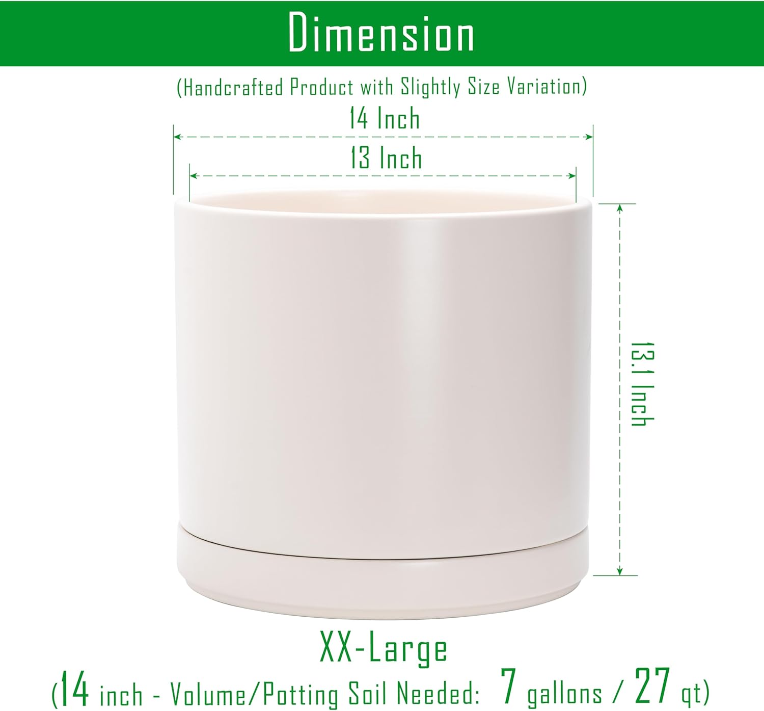 - XXLarge 14 Inch Planter Pot: 14" Diameter x 13.1" H, oatmeal color. Potting Soil Needed: 7 gallons / 27 qt.