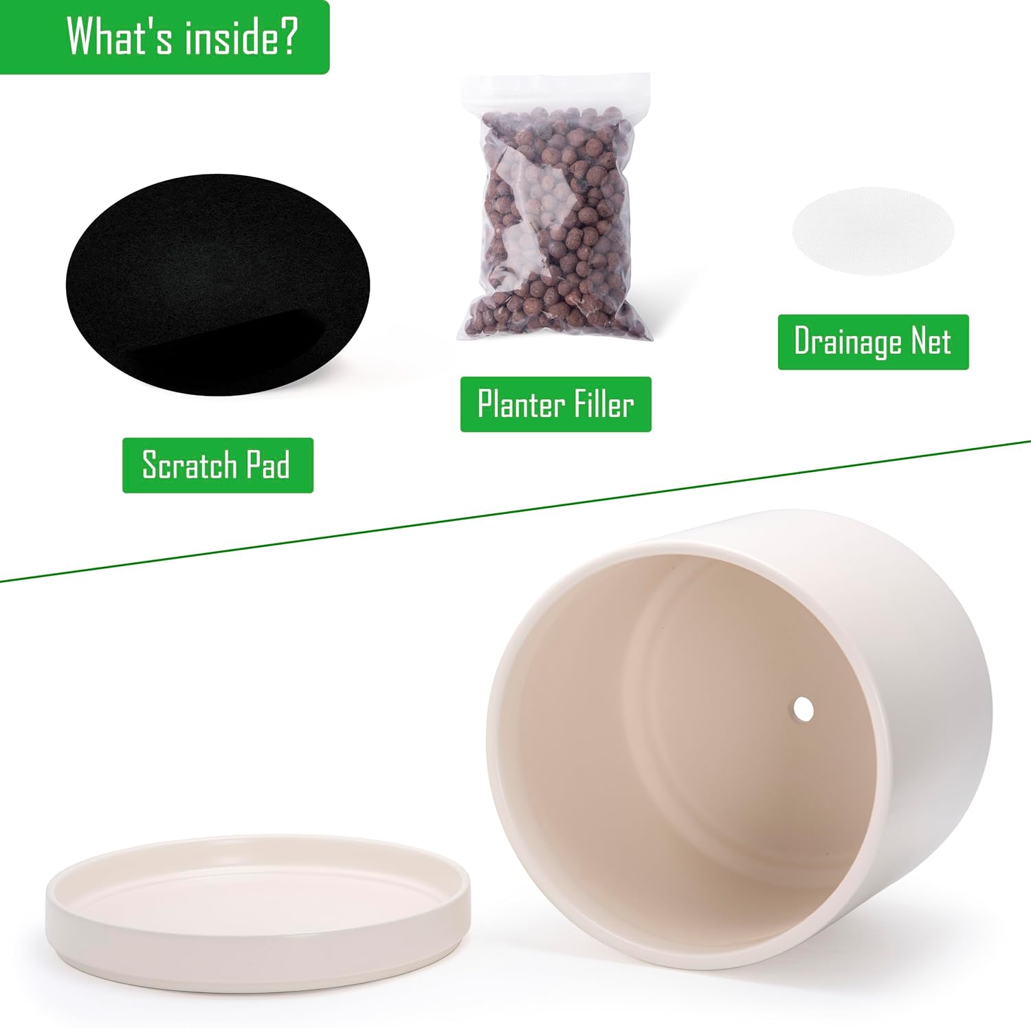 - Planter pot with drainage hole, mesh drainage net and protective scratch pad included.