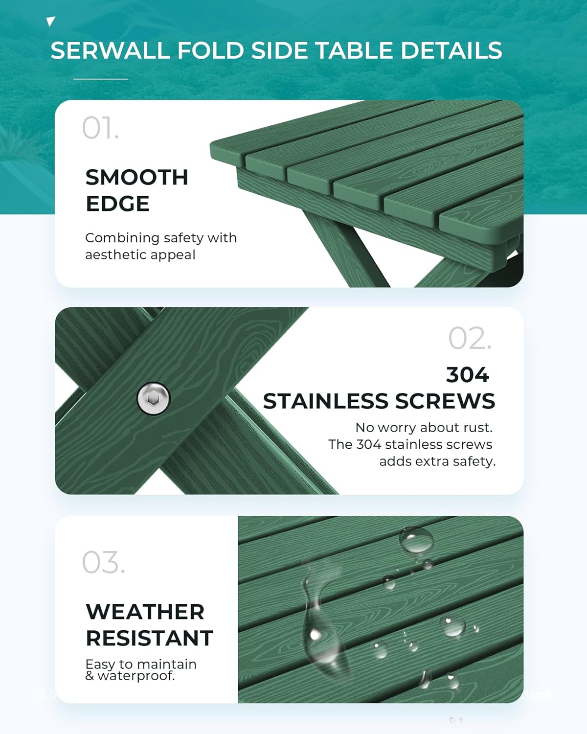 - [Foldable Outdoor Side Table] The SERWALL Adirondack Side Table features a foldable design that significantly reduces its footprint when folded, providing an optimal space-saving solution for outdoor enthusiasts.