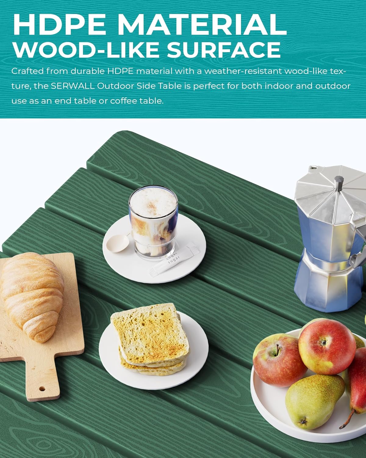 - [Low Maintenance Beauty] The SERWALL outdoor end table's wood-textured HDPE surface requires no painting or staining. A simple soap and water clean ensures a pristine look, making it the ultimate in easy maintenance.