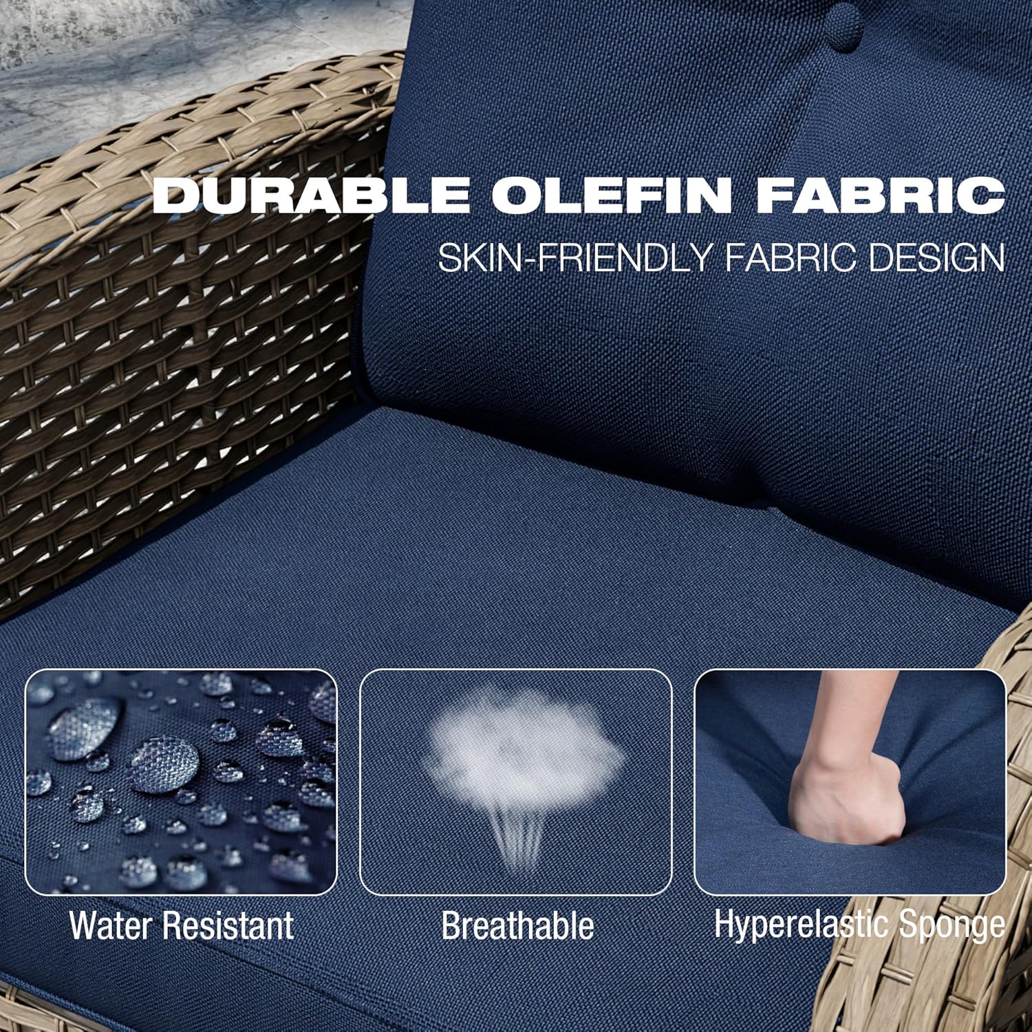- Premium Material: The swivel chair frame is made of powder-coated steel, capable of supporting up to 300 pounds. The cushion fabric is crafted from premium OLEFIN material, which is fade-resistant and splash-proof. It ensures a sturdy and secure foundation, built to withstand the test of time and use