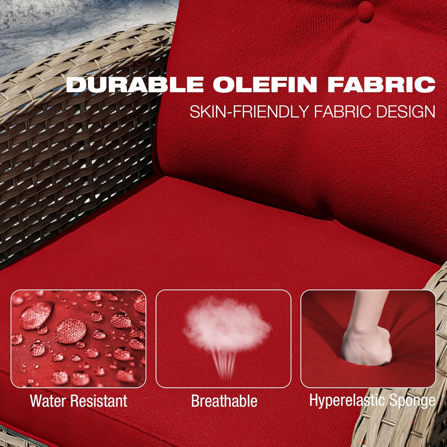 Joyside Outdoor Swivel Rocker Chairs, 3 Piece Wicker Patio Set with Thick Cushion and Side Table, Rattan Patio Swivel Rocking Chairs for Porch, Deck Use (Natural/Red, 3 PCS)