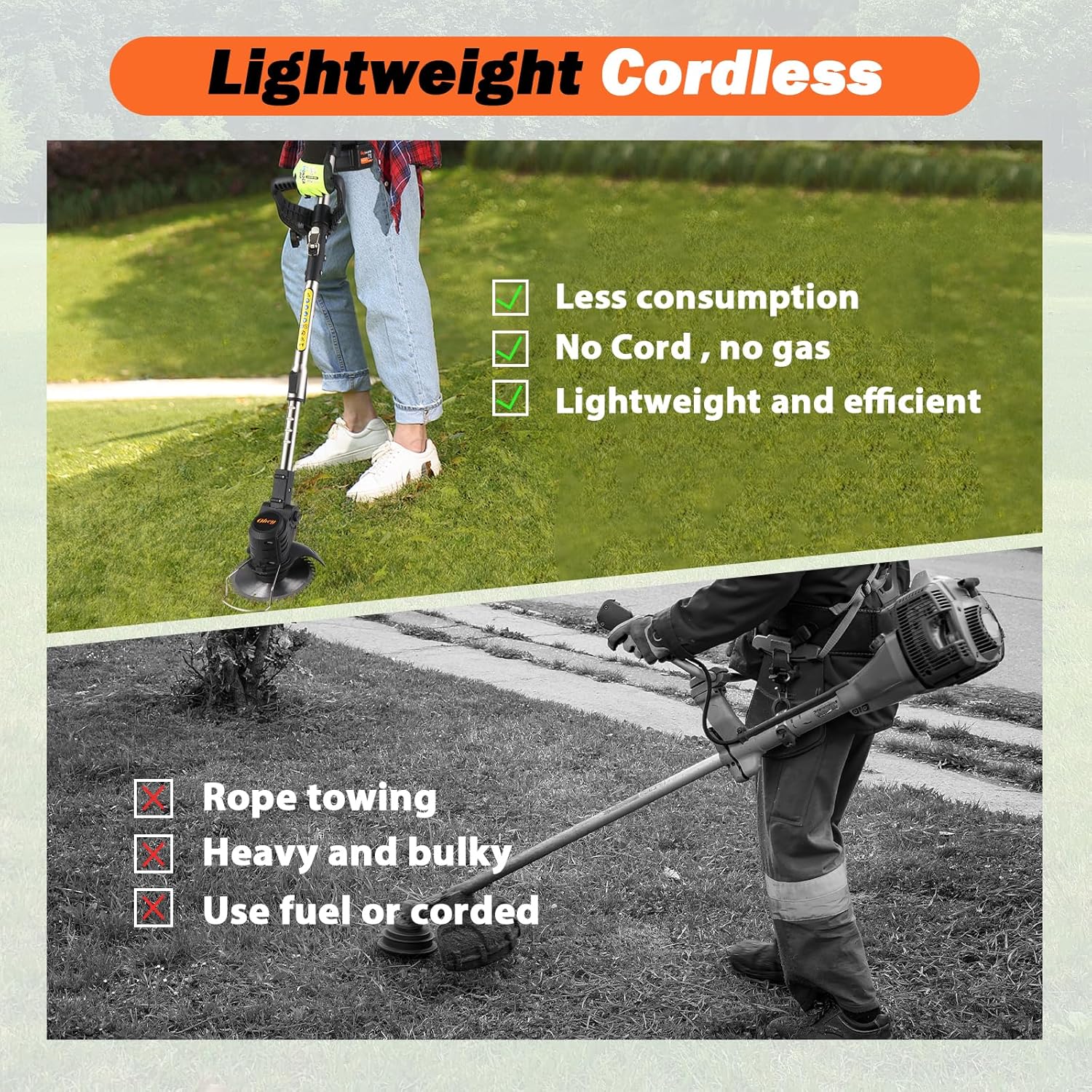 - Lightweight & Safe Design for All Users: This portable weed eater is easy to handle for everyone, from elderly users to those with limited strength. The ergonomic design on cordless weed wacker ensures comfort during prolonged use, and the built-in safety lock prevents accidental activation, while the grass baffle keeps debris under control.