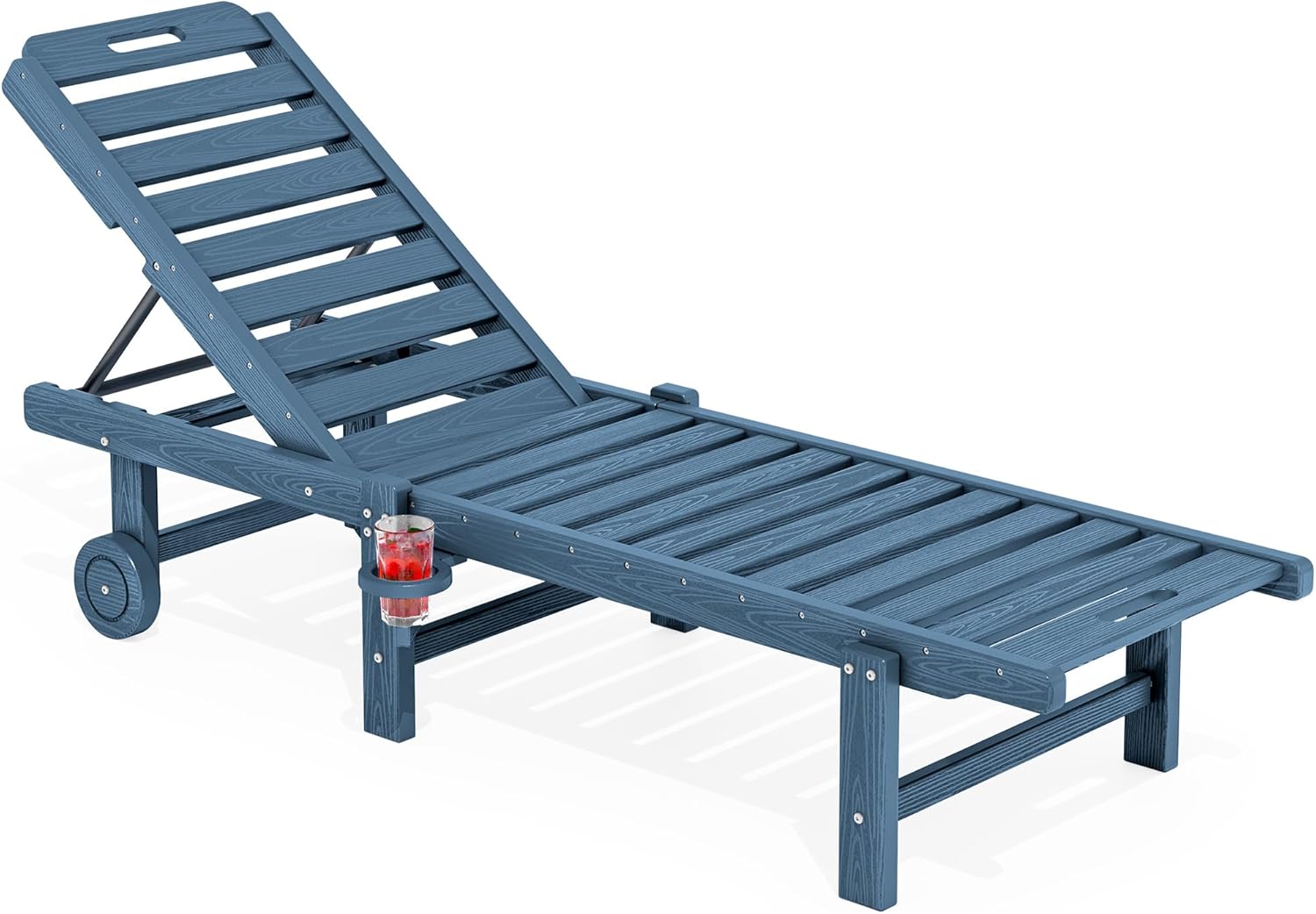 SERWALL Outdoor Chaise Lounge, 78" Length Patio Chaise Lounge Chair with 5 Positions Adjustable Backrest, HDPE Lounge Chair with Rolling Wheels & Cup Holder for Pool, Blue