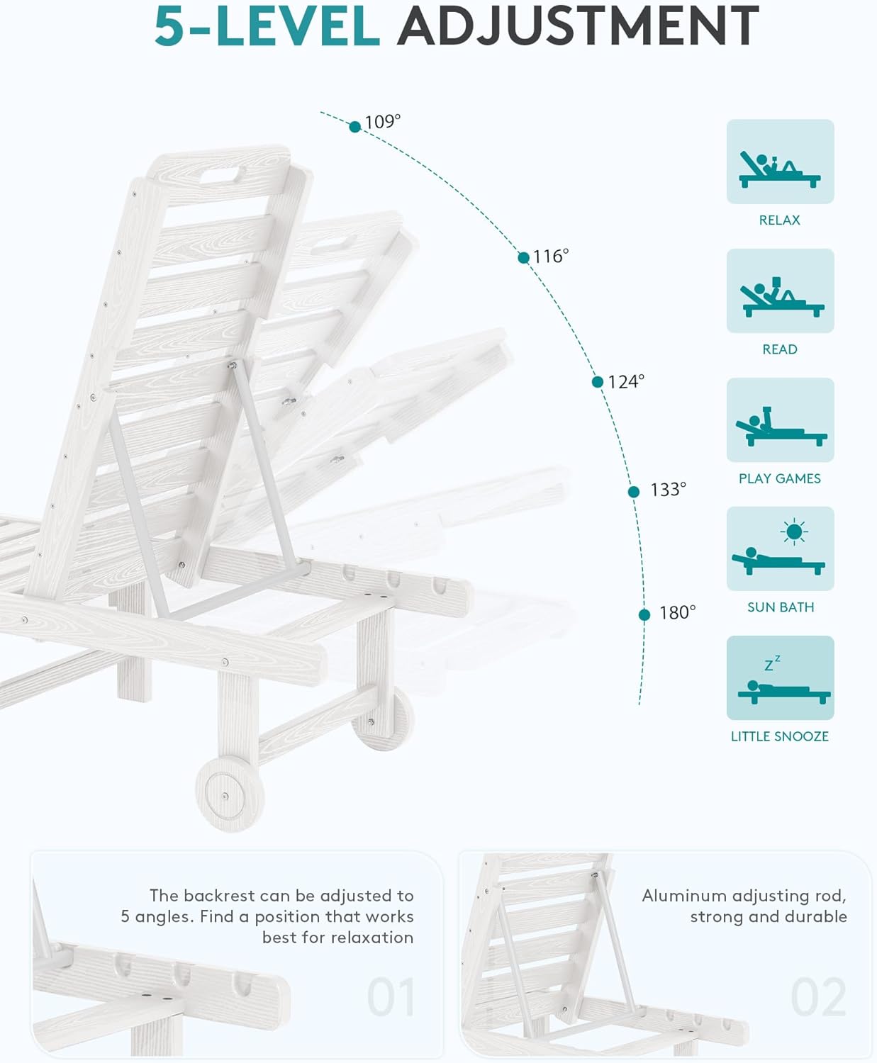 - 5-Position Adjustable Backrest: Our patio lounge chair offers a versatile 5-position adjustable backrest, allowing you to freely switch between sitting and lying down. Whether you prefer sunbathing, tanning, reading or taking a nap, you can find your perfect angle