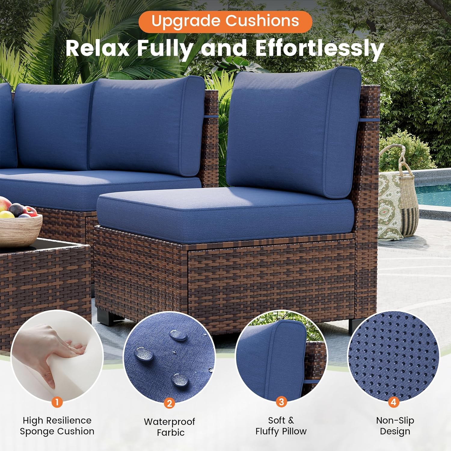 - Cushions for Ultimate Comfort: The 4" high-density foam seat cushion provides firm yet cozy support, while the well-filled back cushion offers a plush, cloud-like feel. Non-slip granules and tie straps keep them securely in place. Wrapped in durable 220D waterproof, fade-resistant fabric, these cushions withstand the elements while staying soft and stylish.