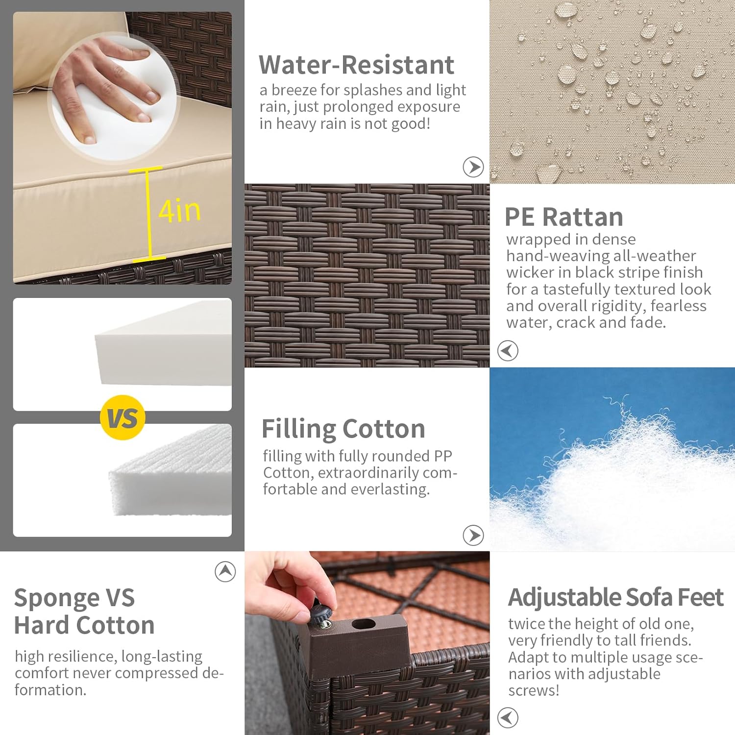 - Comfortable and Non-slip: seat cushions(4 inches) with high resilience sponge and bottom array anti-slip dotted fabric, match up plump back cushions with water-resistant, color retention fabric covers for lasting appeal with outdoor patio furniture, which is extraordinarily comfortable and everlasting
