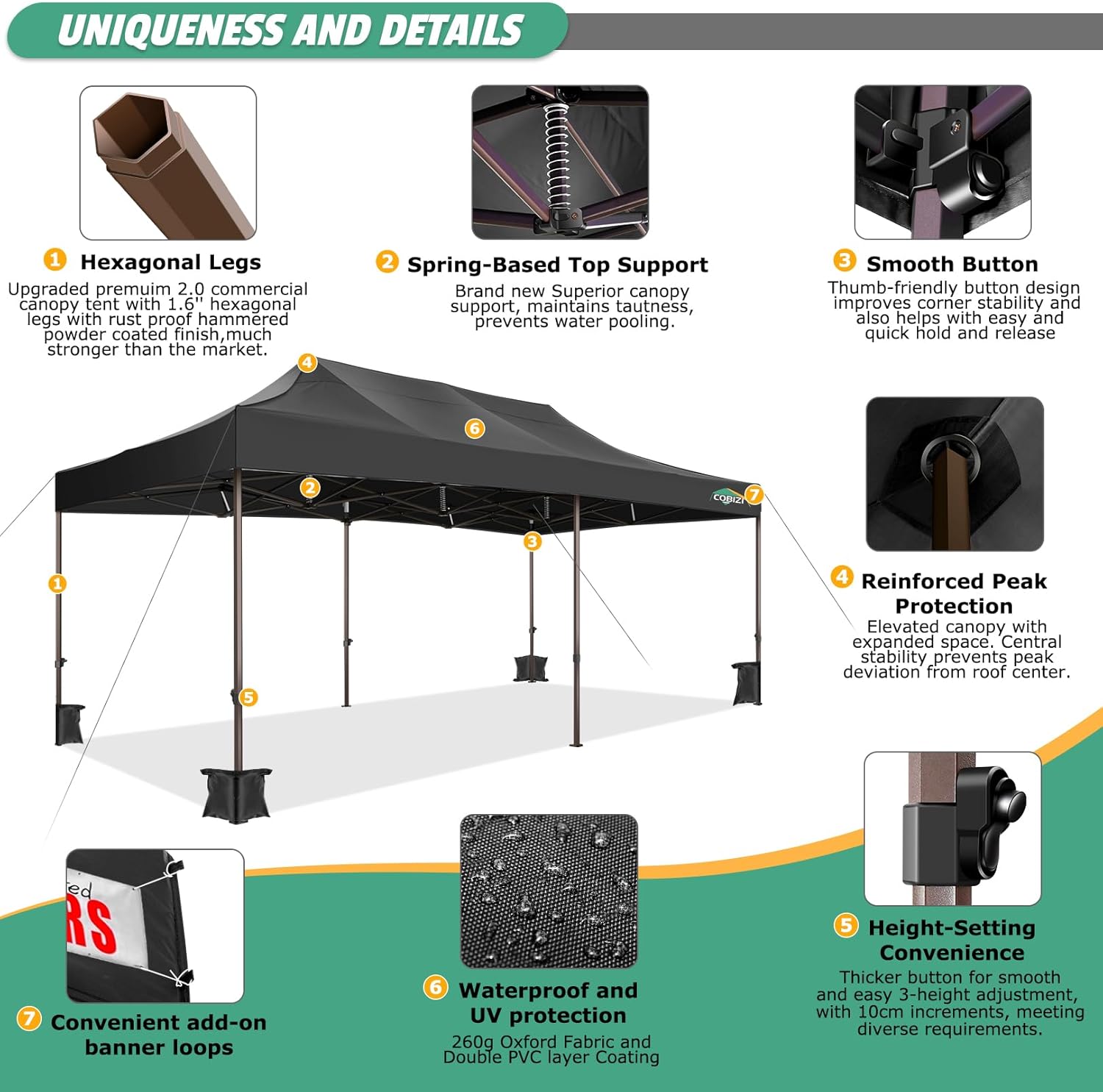 COBIZI 10x20 Pop Up Canopy Heavy Duty with 6 Sidewalls, Commercial Heavy Duty Pop Up Tent for Parties All Weather Waterproof and UV 50+ Wedding Tent with Roller Bag(Legs Upgraded),Black