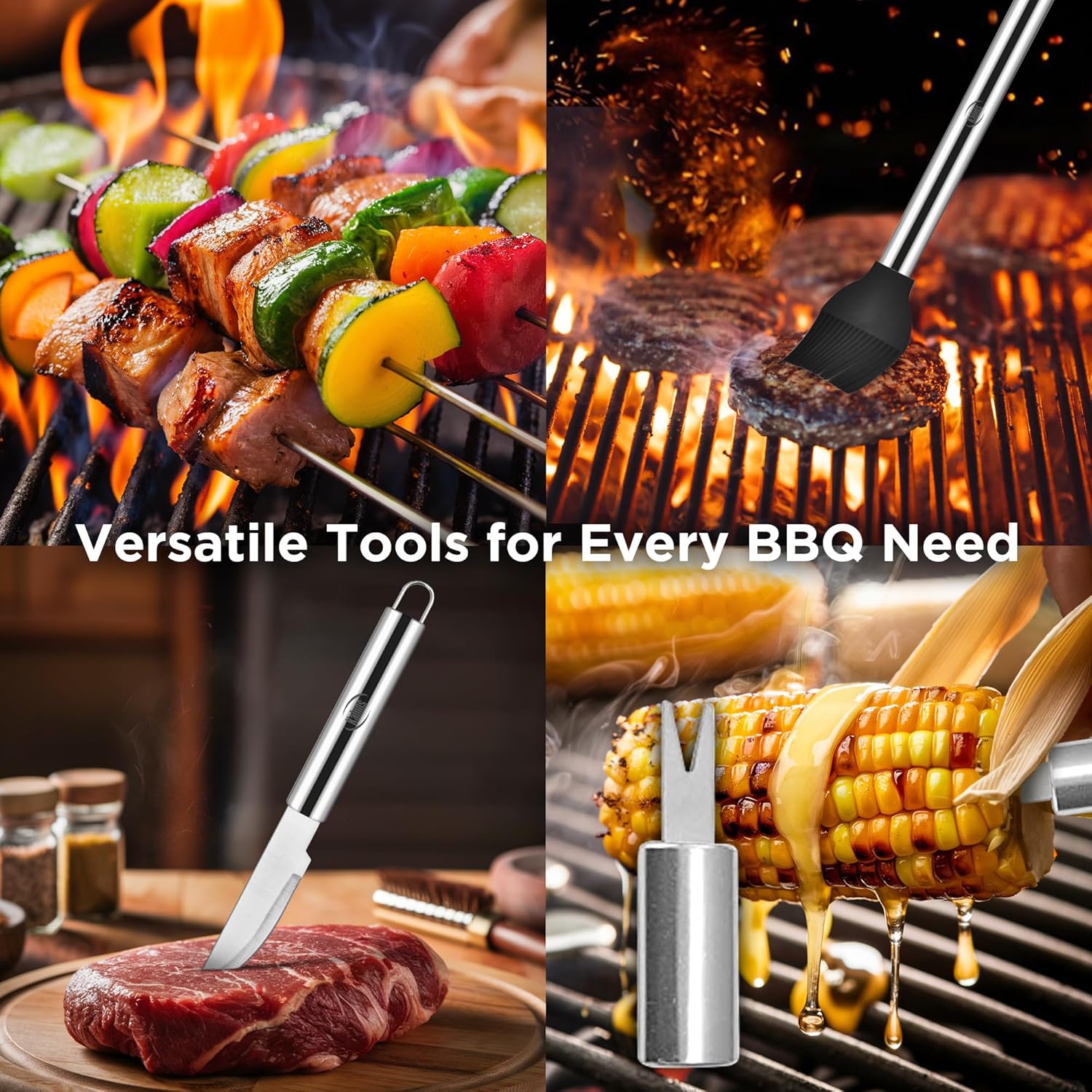 - COMPLETE GRILL SET: Upgrade your grilling game with this 20-piece set! Includes: Tongs, fork, knife, and basting brush, Grill brush with extra head, 4-function spatula, 4 skewers and 8 corn holders, and a Portable storage bag. This comprehensive set has everything you need for a professional grilling experience.