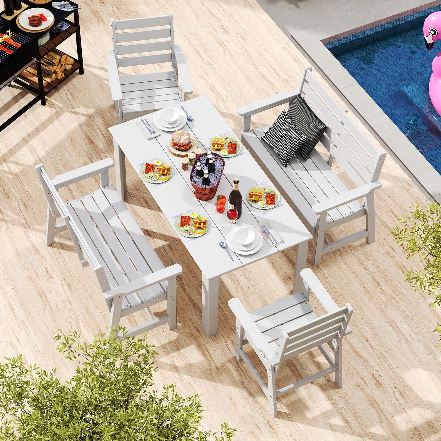 - 【Premium HDPE】Crafted from GreenVines HDPE (High-Density Polyethylene), this outdoor bench outperforms traditional metal and wood materials. It is waterproof, weather-resistant, and fade-resistant, ensuring it won’t rust, chip, peel, crack, or rot, even in harsh outdoor conditions