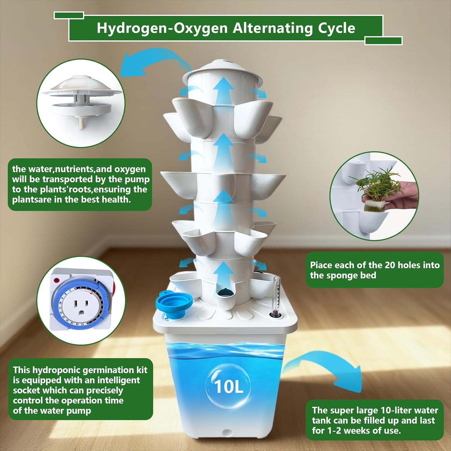 - 【Easy to Use】: Our hydroponic tower provides soil-free growing options for indoor and outdoor gardening. Our vertical hydroponic tower has a simple design and clear instructions, making plant growing easy and fun. Anyone can use this hydroponic planting system kit to harvest fresh, farm-quality vegetables at home.