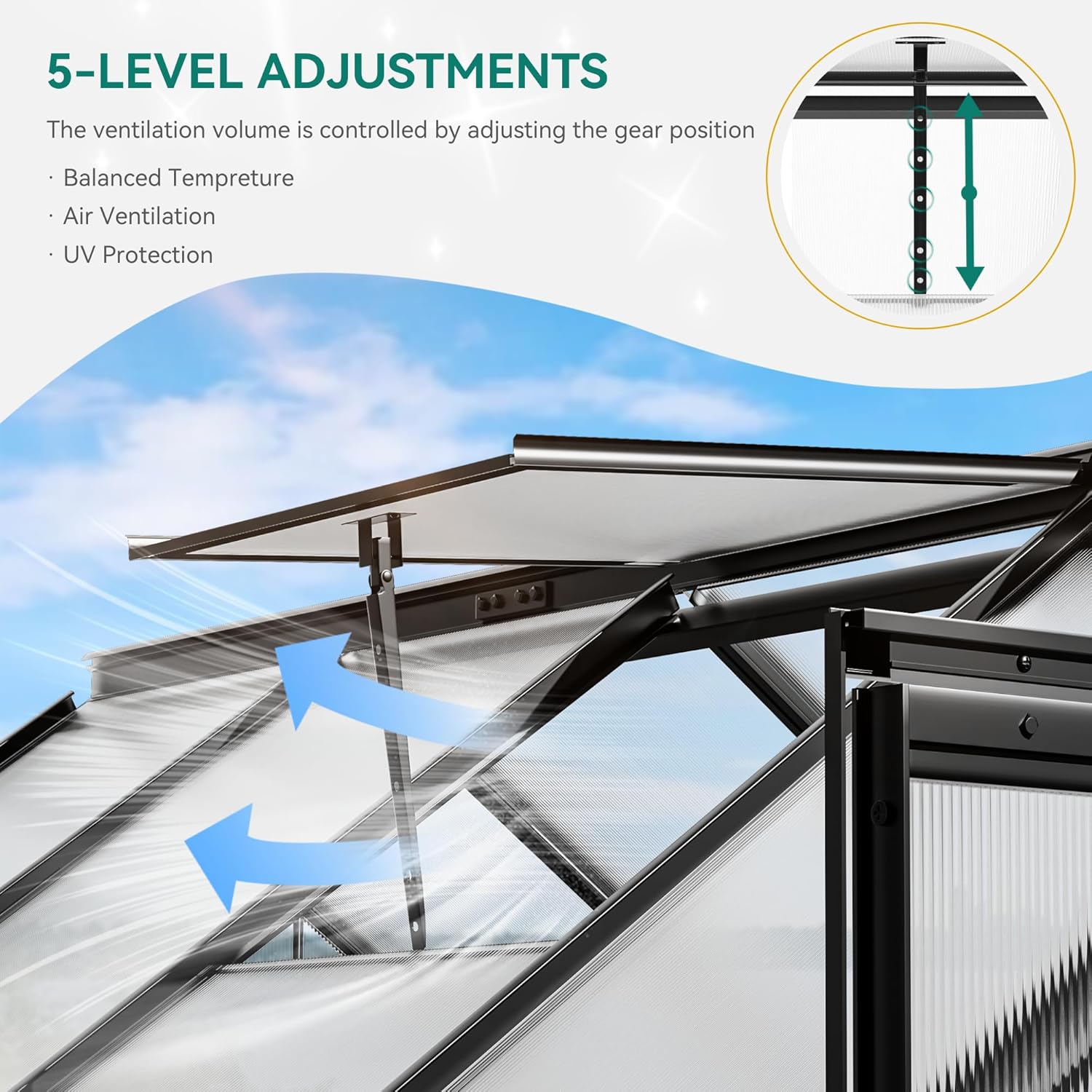 - CUSTOM ADJUSTMENT- This heavy duty green house features adjustable skylights with various opening angles available, creating optimal air circulation system to sustain indoor ventilation and cooling; Innovative sliding door allows for seamless opening and closing, and saves more space than traditional ones