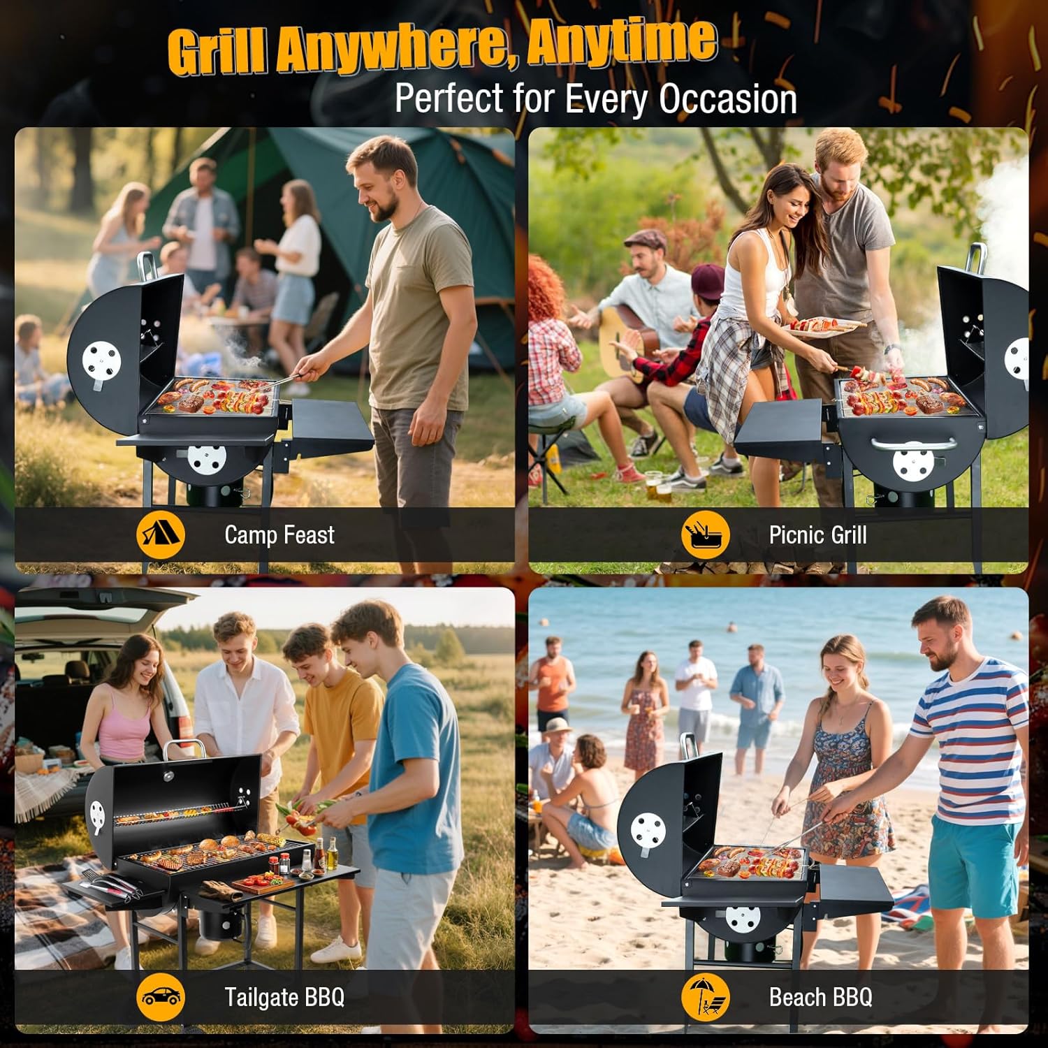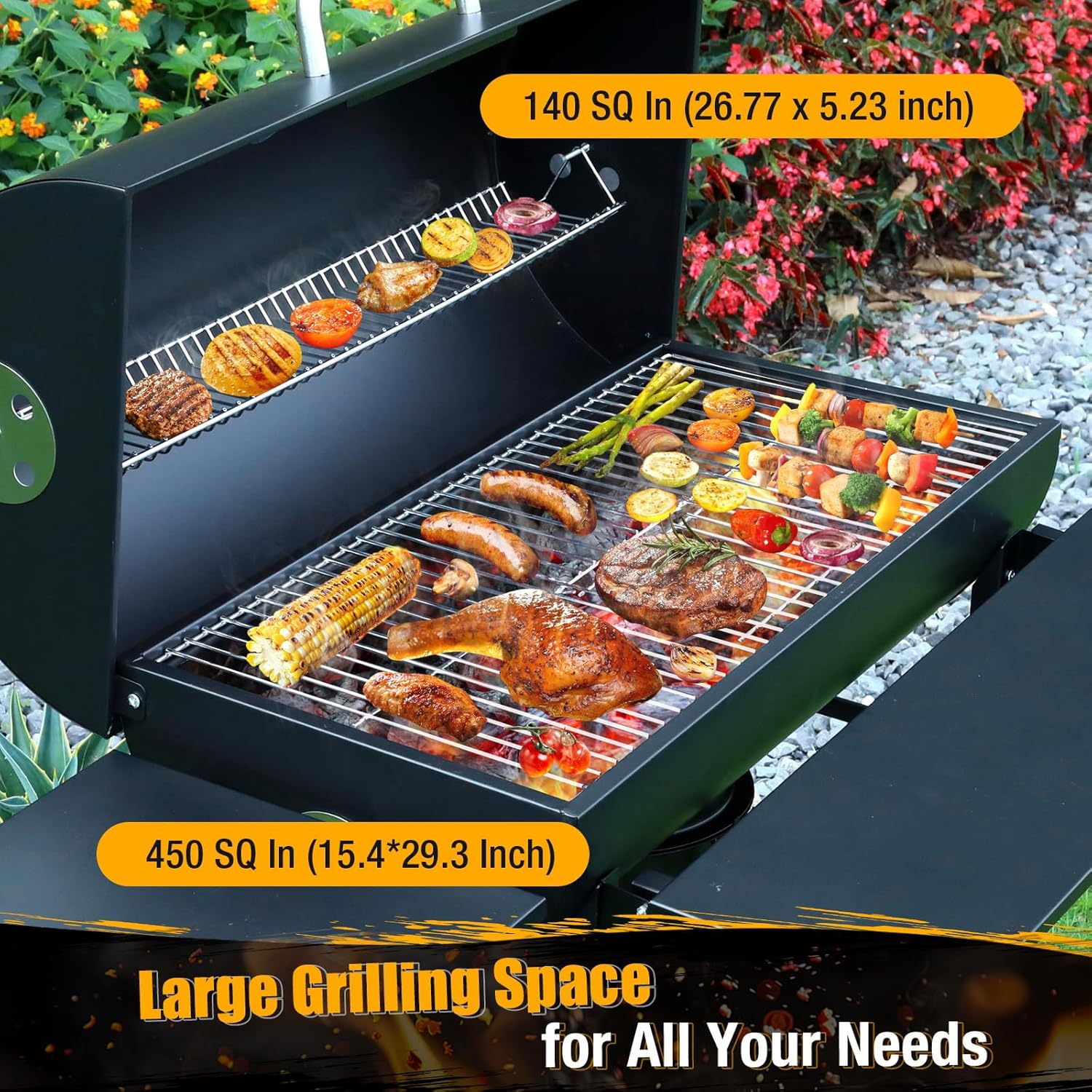 - Expansive Cooking Surface: With 589.32 sq. in. total cooking space, our charcoal bbq grill is ideal for 5–6 BBQ lovers. The main cooking grill includes a convenient lift-up grate for easy coal refills, while the warming rack keeps food hot. This backyard grill makes your outside grills outdoor cooking smooth and satisfying