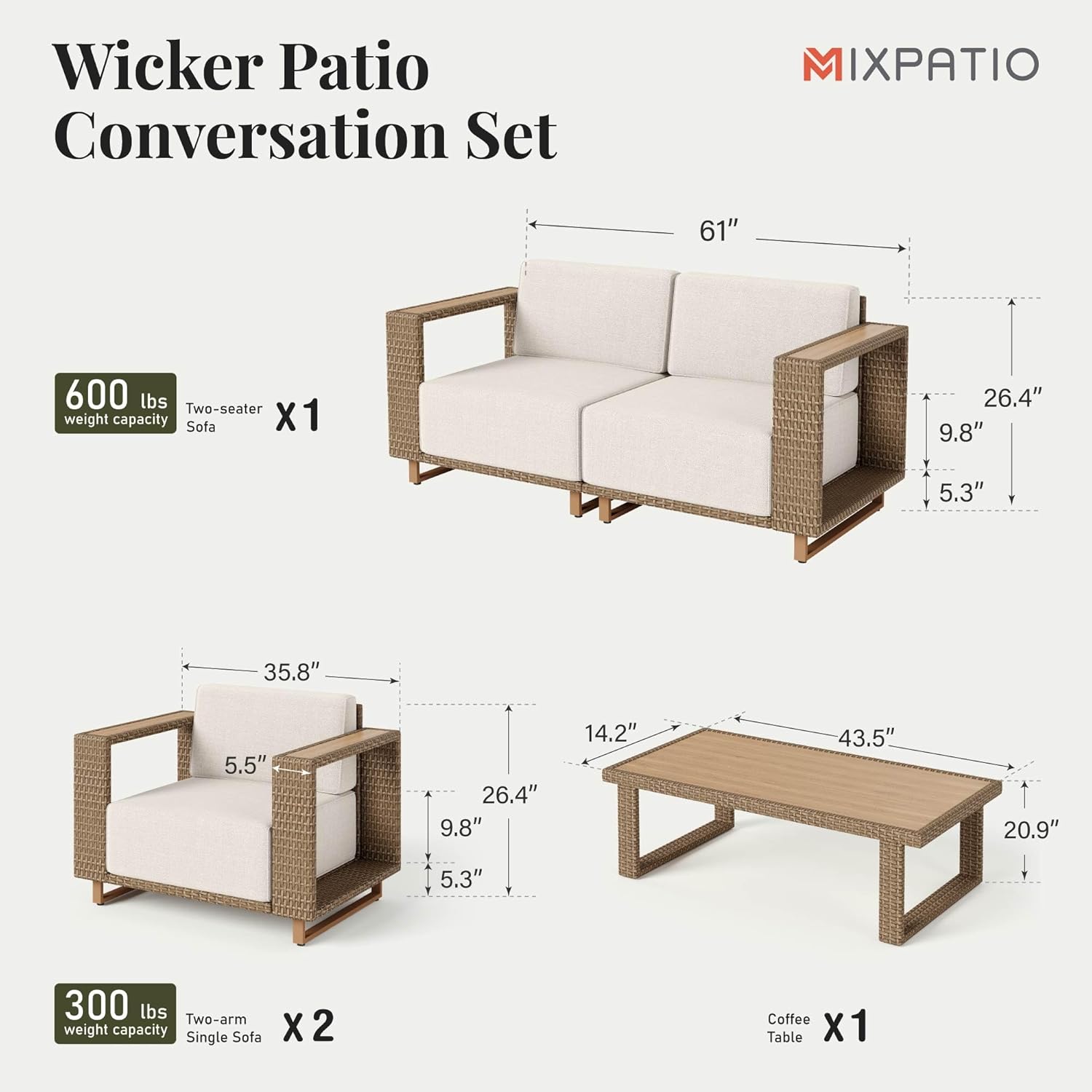 Outdoor Patio Furniture Set, 5 Piece Outdoor Rattan Wicker Sofa Couch, Conversation Set with 2 Single Sofa, 2 Armchairs and Coffee Table for Deck Backyard Lawn