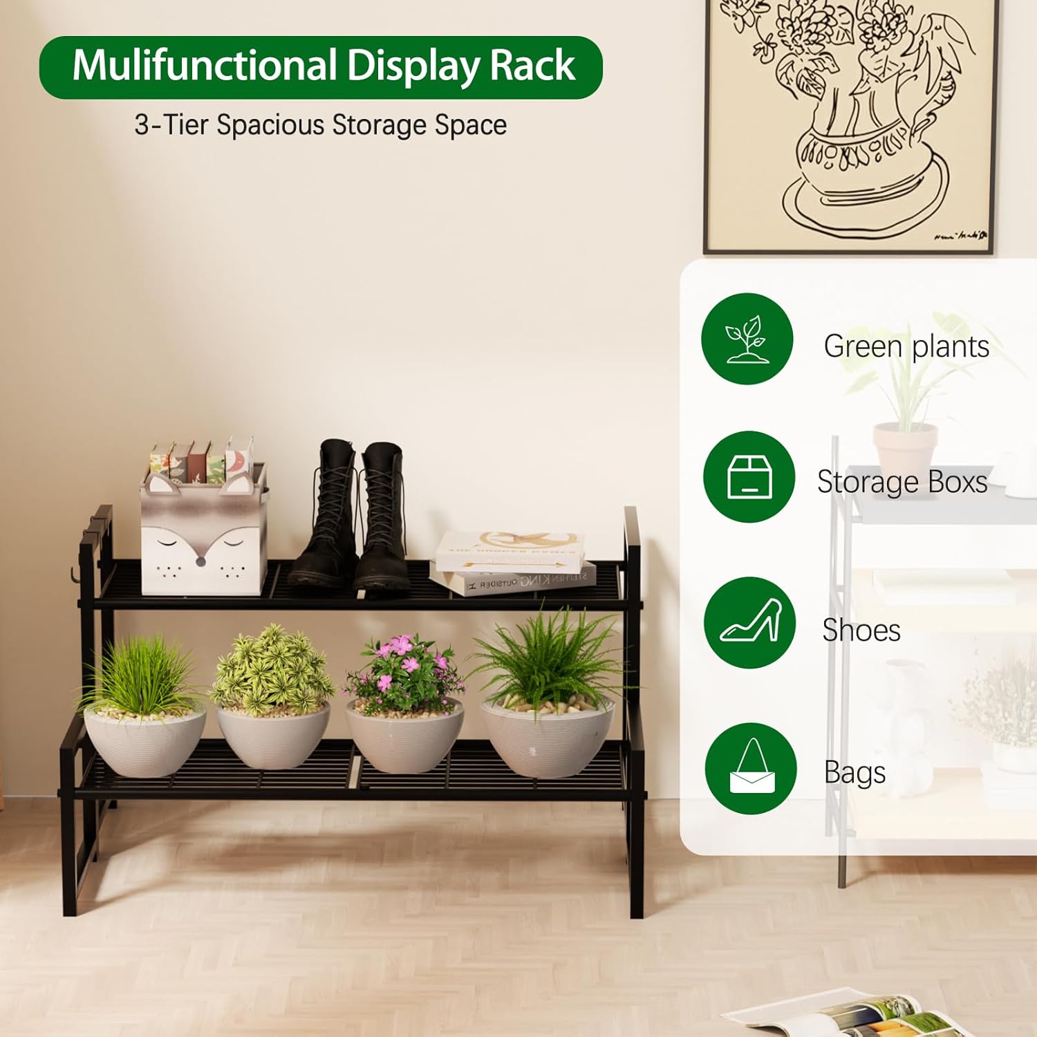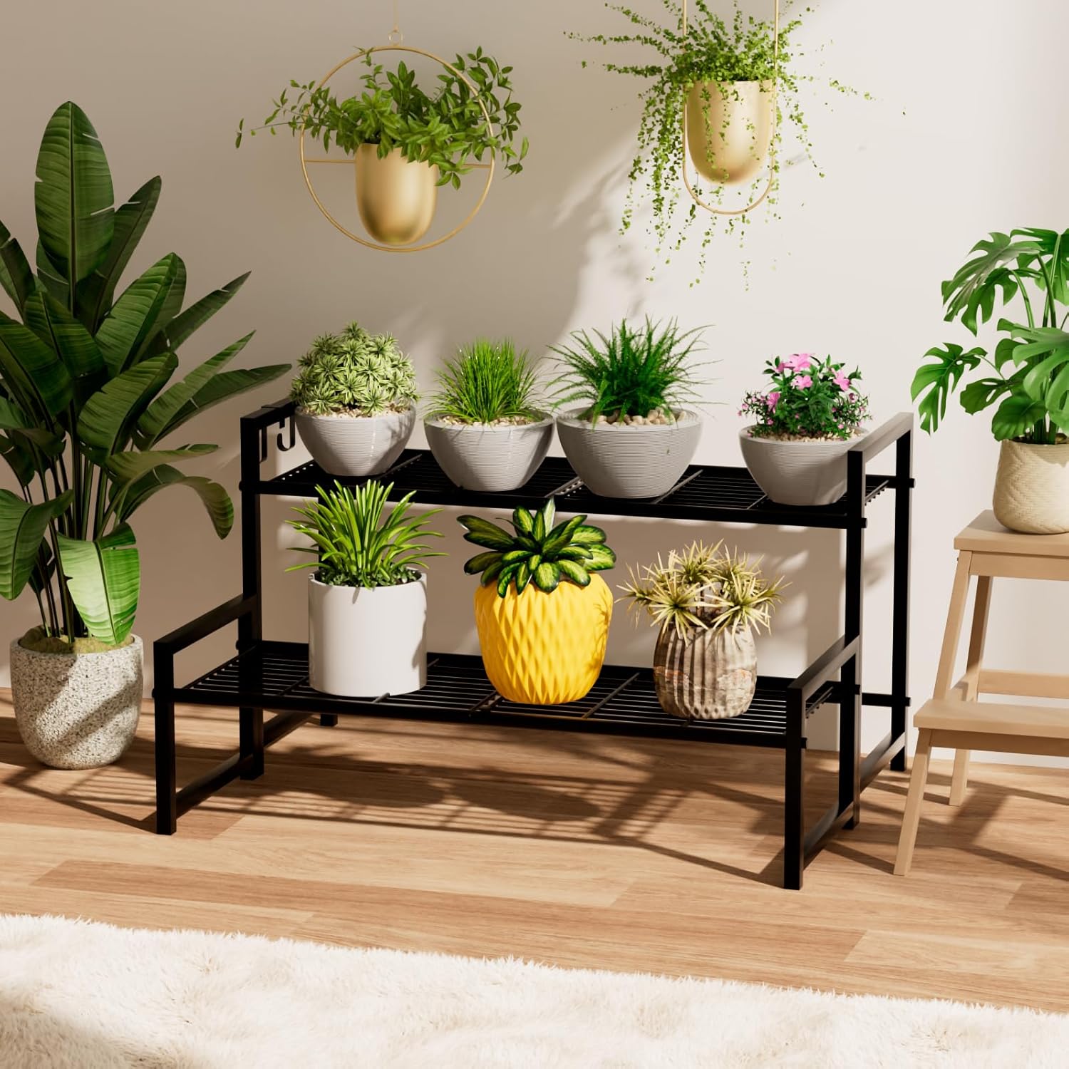 - 【Spacious Storage Space】This black metal plant stand with large storage space helps store your different goods, which makes the patio become tidier. The smart ladder-shaped design also helps save space. This display with a large capacity 2 layers storage space.And this plant rack can also be changed into 3 layers or tall display racks according to your space.