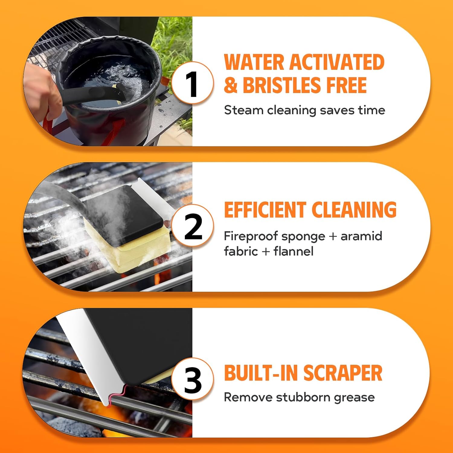 - DURABLE & HEAT-RESISTANT: Crafted with FIREPROOF SPONGE + ARAMID FABRIC + FLANNEL, this Bristle-Free Barbecue Brush withstands high temperatures, making it a reliable tool for all your grilling needs, even on hot grills ( Our premium grilling cleaning head is heat resistant up to 600°F )