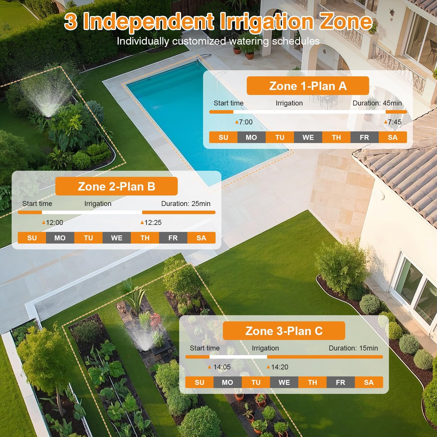 - Sprinkler Timer 3-Zone Custom Watering System: Address different watering needs effortlessly with this WiFi sprinkler controller's dual-zone functionality. Program individual schedules for each zone in your garden watering system, customizing start times, duration (1 minute to 24 hours) and frequency. The sprinkler timer 3 zone design ensures perfect coverage for lawns, flower beds and vegetable patches