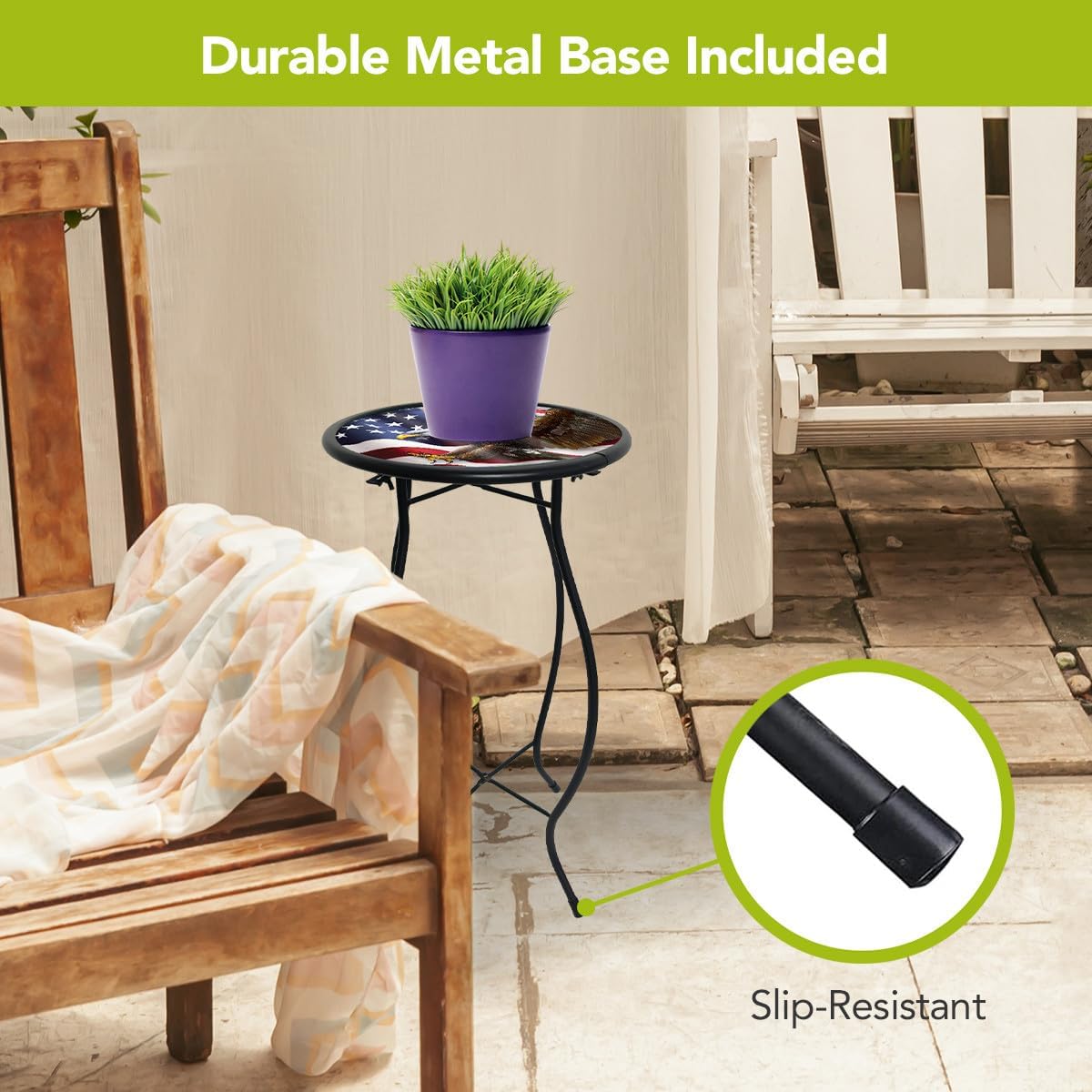 - Printed Glass Top Catches Sunlight Enhancing Porch or Patio
