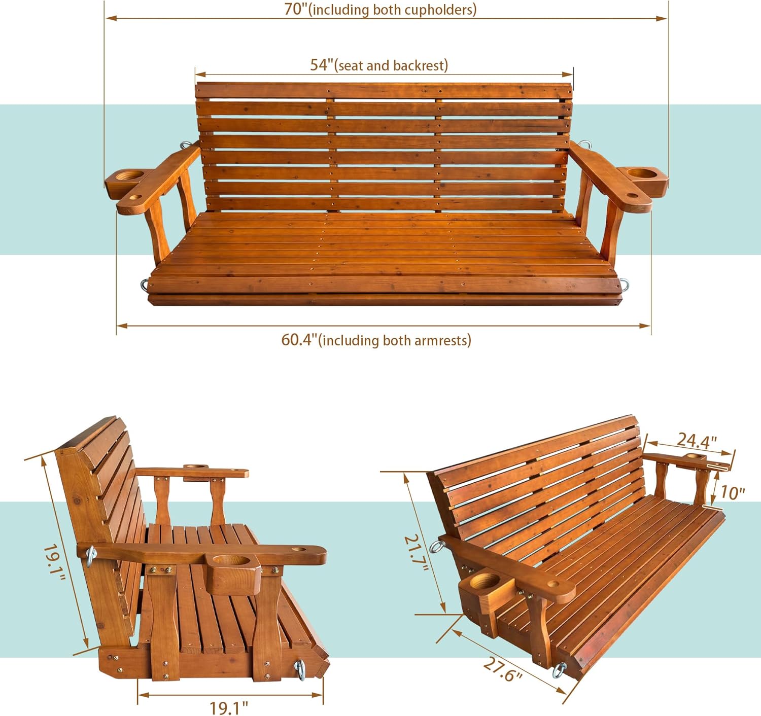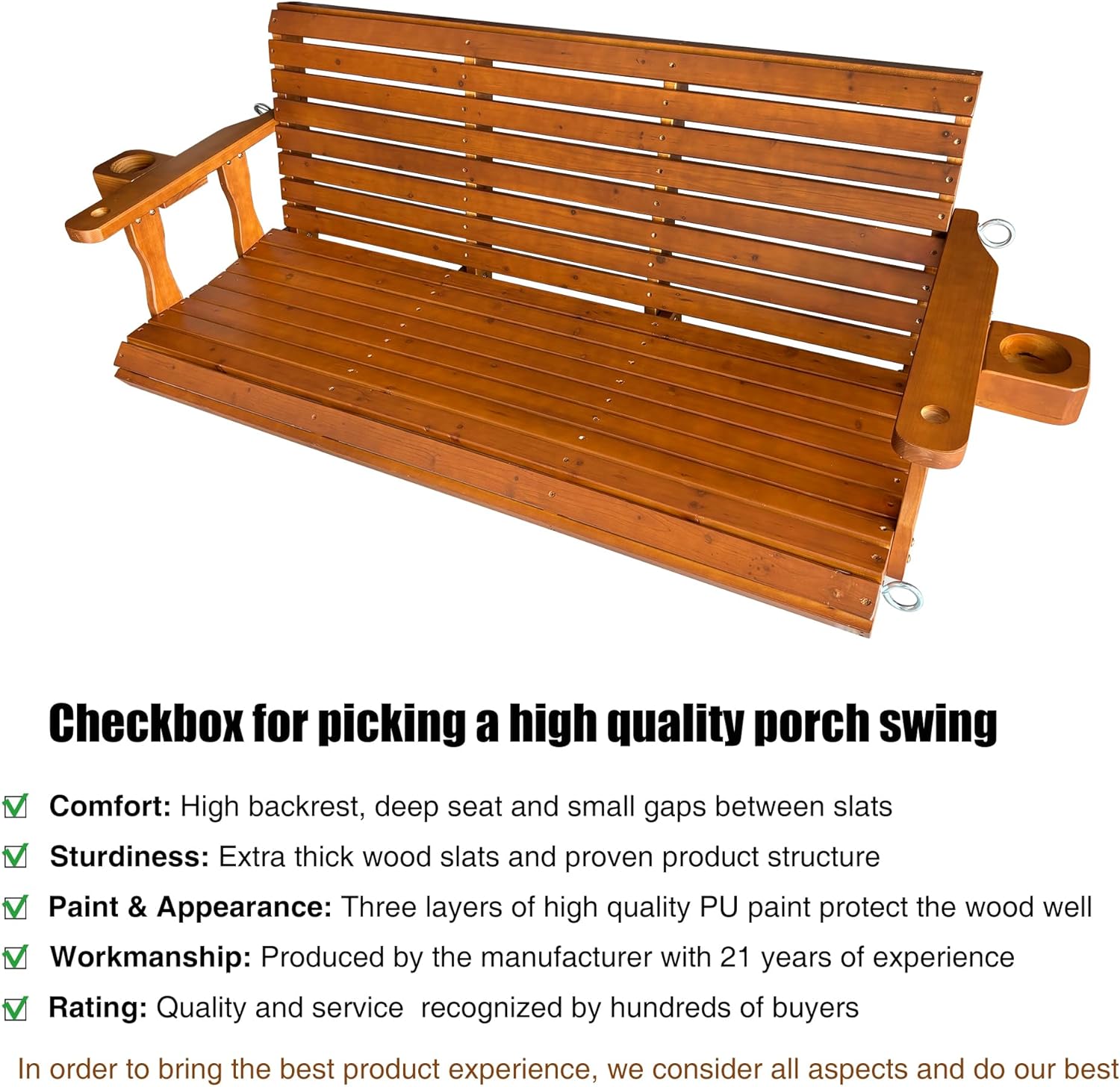 Wooden Porch Swing 3-Seater, High Backrest and Deep Seat, Bench Swing with Cupholders, Hanging Chains and 7mm Springs, Heavy Duty 880 LBS, for Outdoor Patio Garden (Cedar Tone, 5 FT Extra Large)