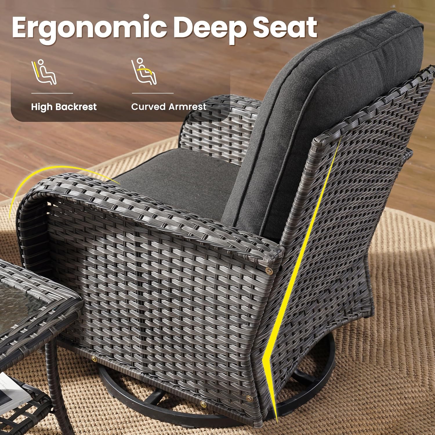 - Rocking Swivel Chairs: The fully rotating patio chairs allows you to 360 degrees swivel and 30 degrees rocking smoothly and silently. The unique forward and backward swing design allows you to easily enjoy a comprehensive comfortable experience, whether it's gathering, reading, or relaxing, you can find the most comfortable angle