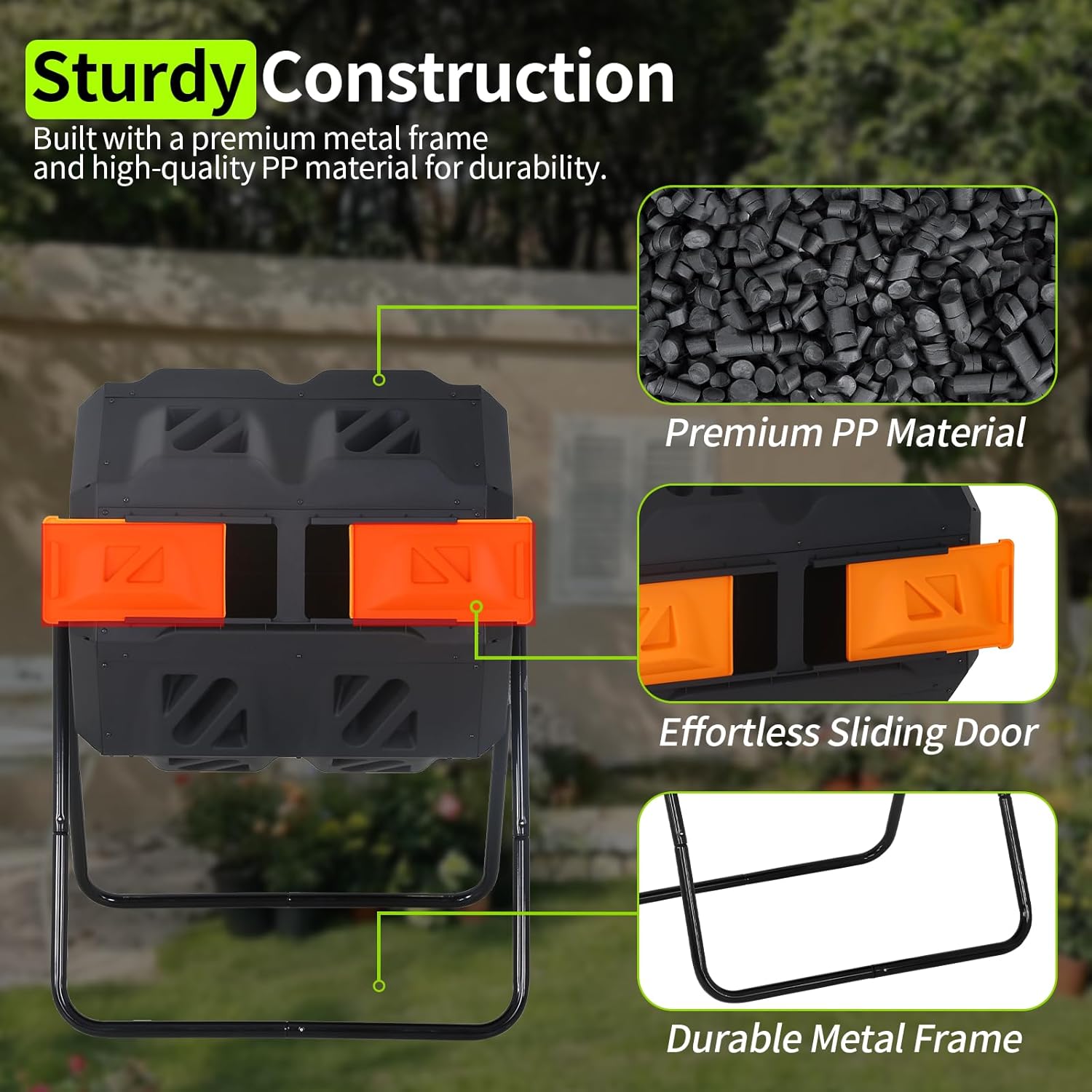 - Durable and Weather-Resistant Made of high-quality PE material and a reinforced metal frame, this outdoor compost bin is UV-resistant, weatherproof, and corrosion-resistant, ensuring long-term durability. The BPA-free plastic is safe and eco-friendly, making composting a truly sustainable process.