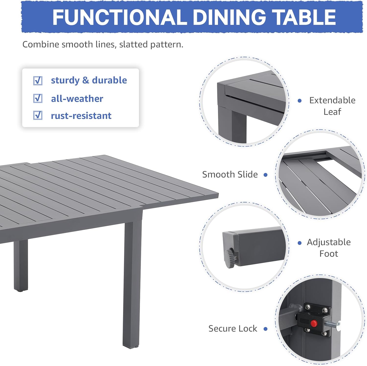 - 【WIDE APPLICATION】: With its extension design and quality aluminum, the extendable outdoor dining table conveniently expands to make it easy for you to add extra seats when needed. Perfect for hosting, either using the expandable table as your main dining table or as a serving table for larger events.