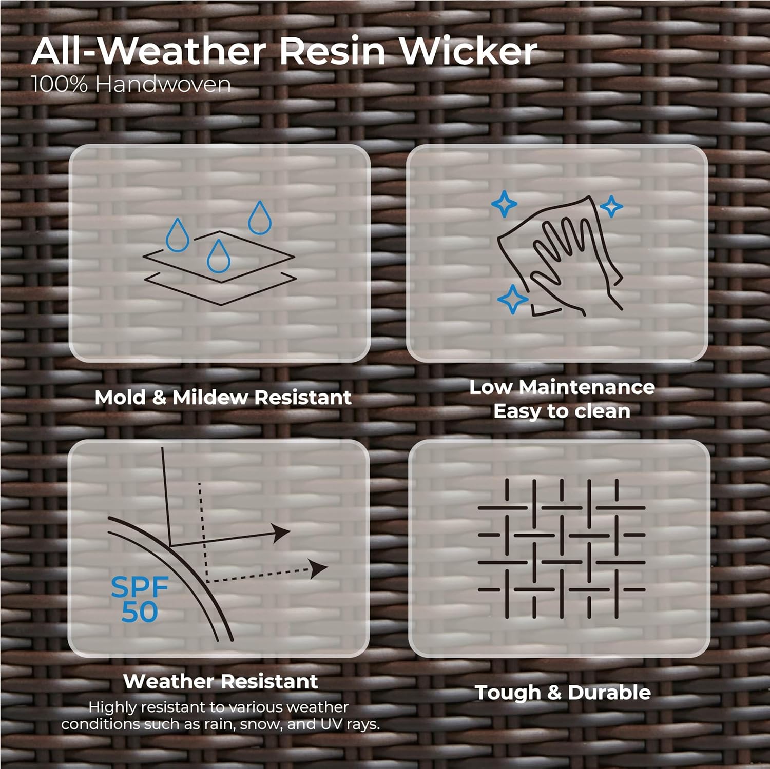 - Four-Piece Set with a Modern Farmhouse Vibe: Crafted with meticulous attention to detail, this patio conversation set combines rustic charm and contemporary design. It boasts all-weather resin wicker intricately handwoven around a sturdy e-coated steel frame, ensuring both durability and elegance.