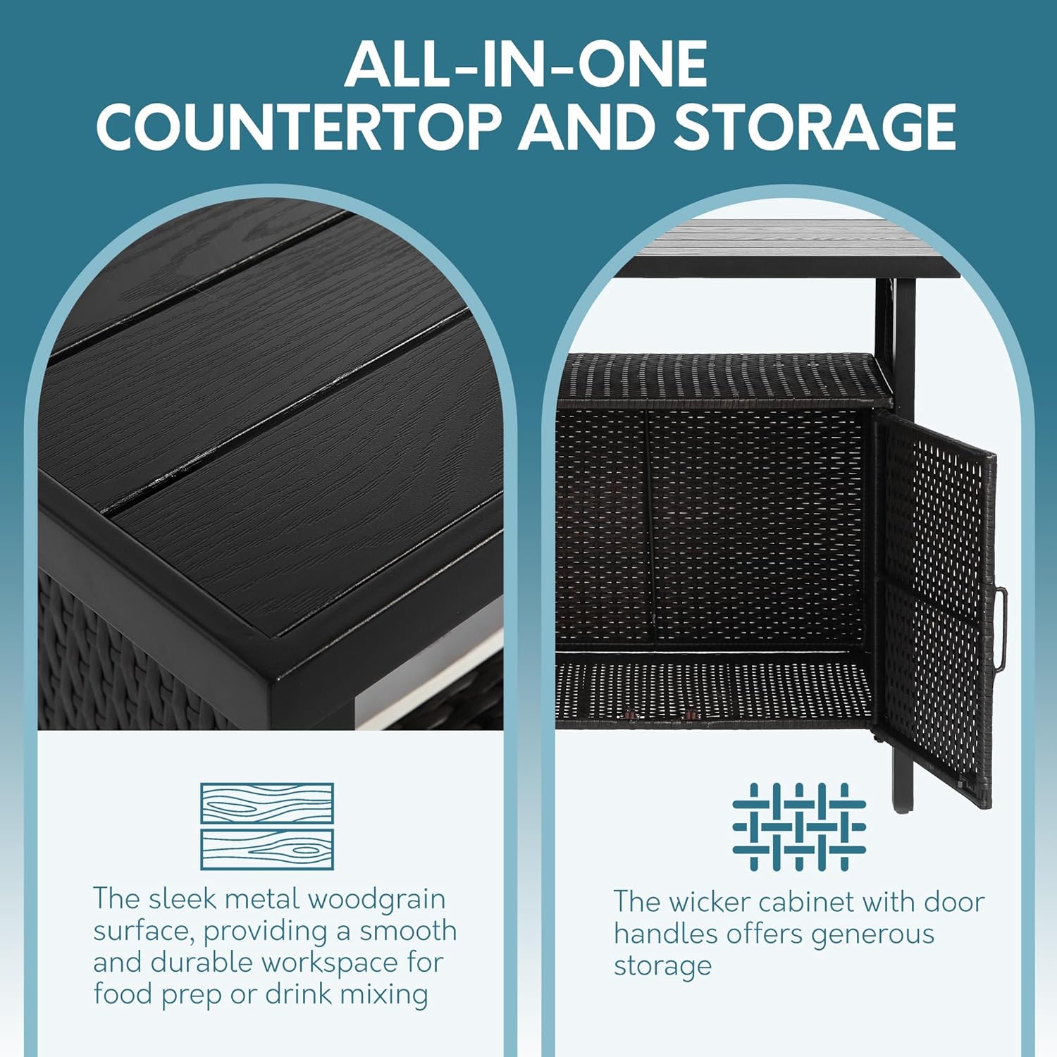- MULTI-FUNCTIONAL: All-in-one outdoor storage and countertop. The wood-like metal serving as an ideal outdoor food prep station.The wicker cabinet with doors features a storage space, providing ample room to store your items