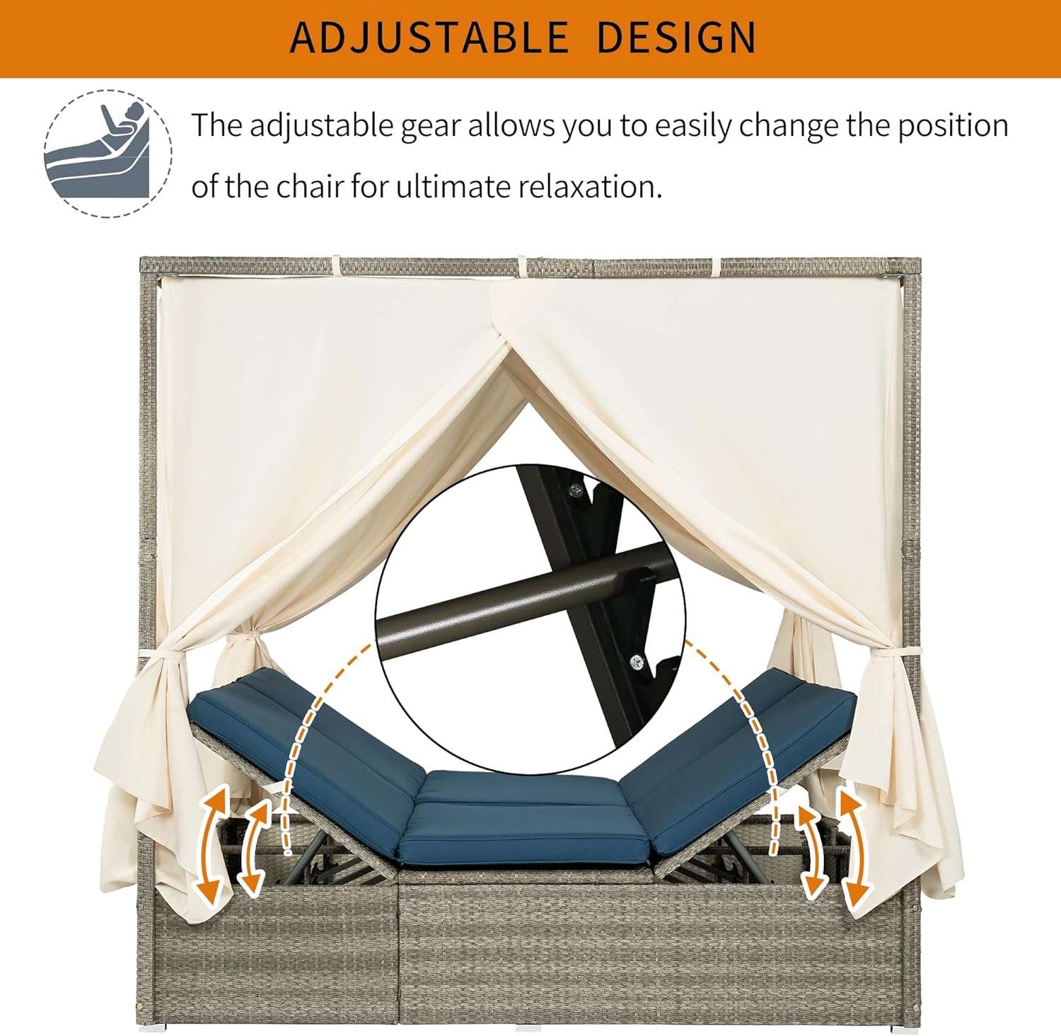 Patio Chaise Lounge,PE Rattan Outdoor Patio Wicker Adjustable Outdoor Sun Bed with Four-sided Canopy and Comfortable Blue Cushion – Versatile Use for Patio, Garden, and Poolside