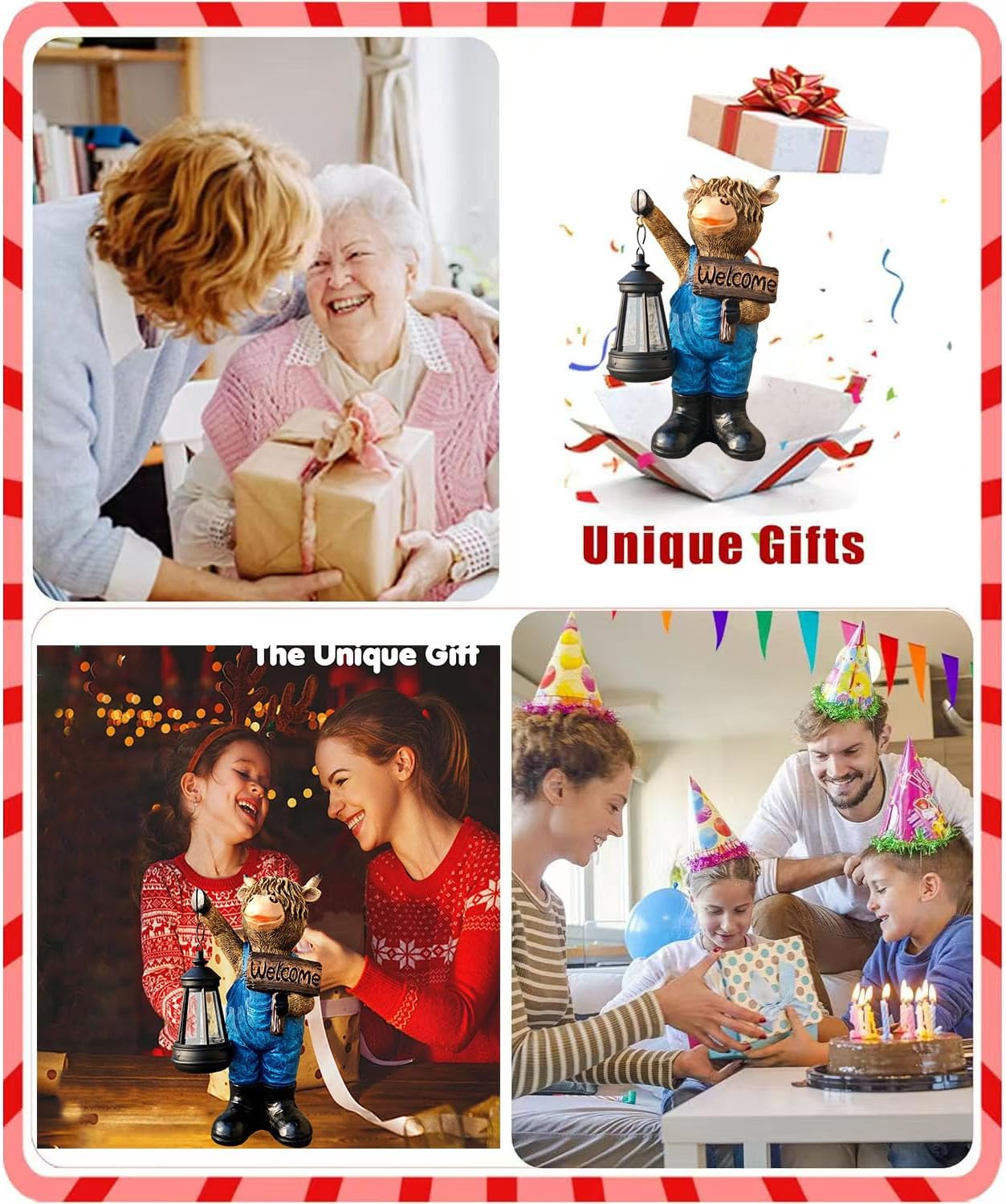 - 【Charming Cow Statue Design】 Features a playful cow figurine wearing bule overalls, holding an LED lantern in one hoof and a "WELCOME" sign in the other, with vivid facial details for whimsical outdoor charm.