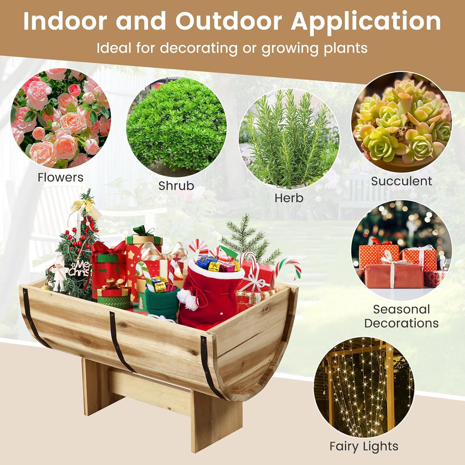 - Indoor and Outdoor Application: The wooden planter box is perfect not only for planting but also for adding decorative flair to your space, adorned with seasonal ornaments, fairy lights, etc. It is an ideal addition for various indoor and outdoor settings, from gardens and patios to porches and balconies.