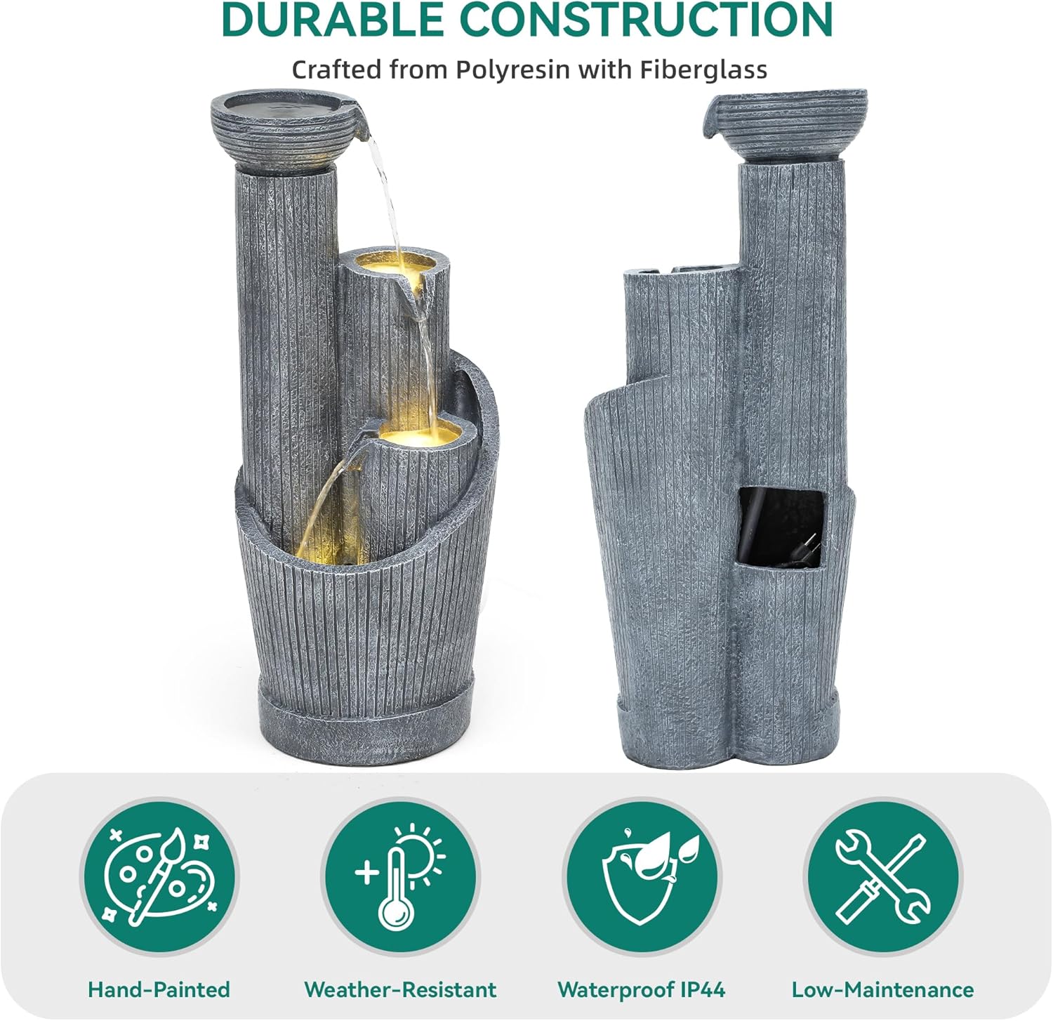 - Modern Minimalist Outdoor Fountain⛲: Showcasing a bold 5-tier geometric pedestal design with a graceful twist, this outdoor water fountain combines clean lines with a handcrafted concrete-style finish and fluted textures. Standing 31" tall, it serves as a striking focal point that brings sleek modern style and peaceful ambiance to any garden, patio, deck, or backyard.